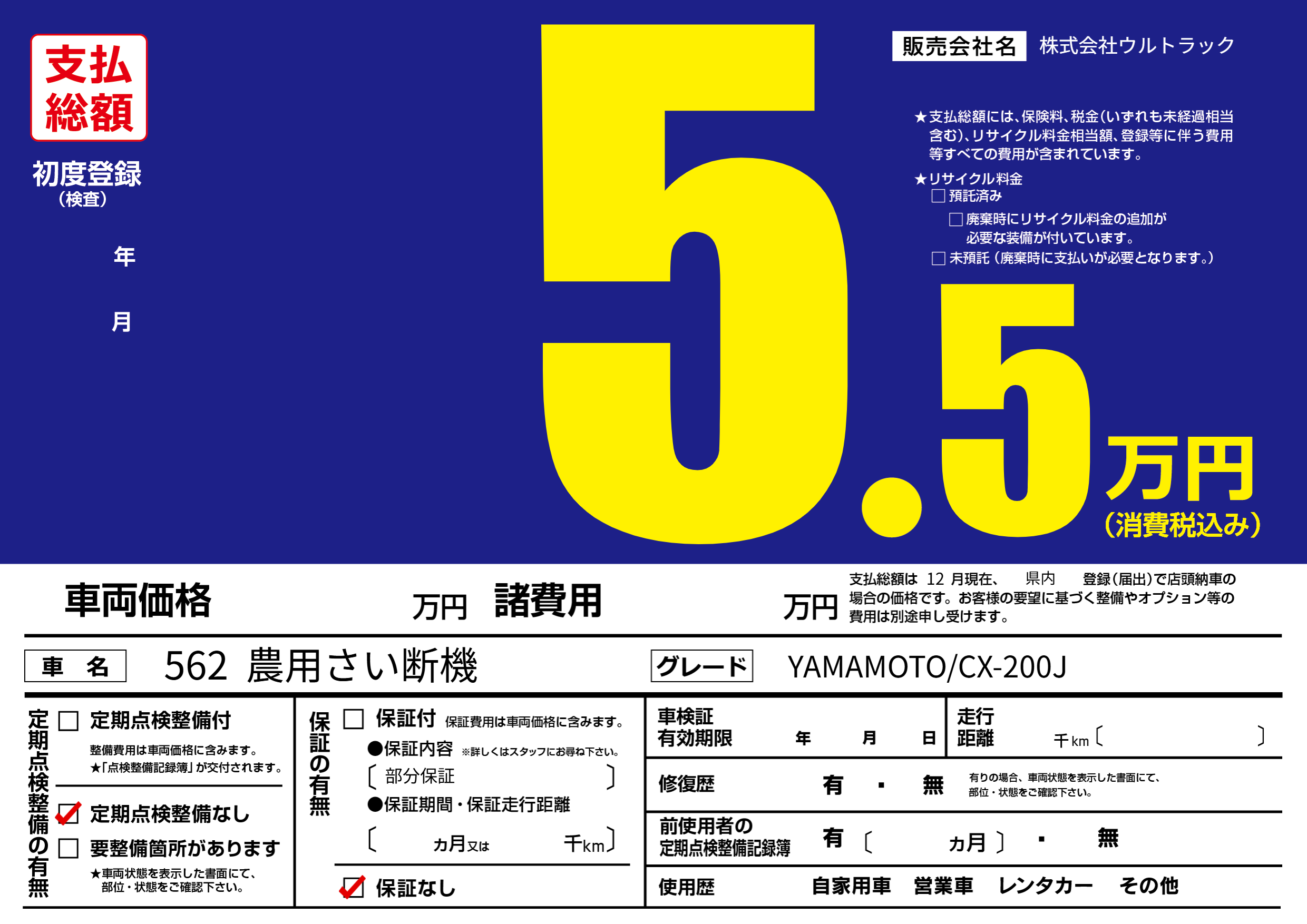 | 車名 | 562 農用さい断機 | グレード ミッション 排気量 |