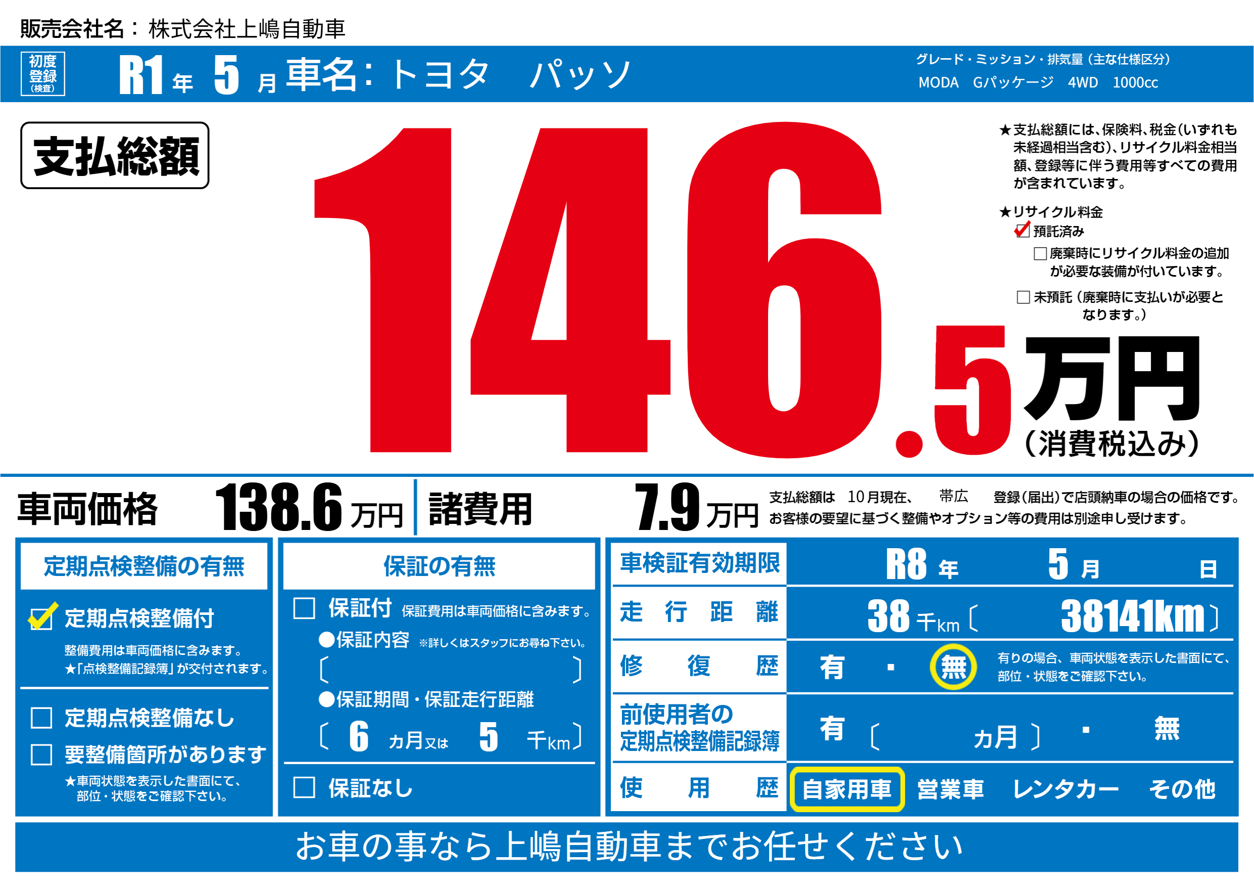 | 車名 | トヨタ パッソ | グレード ミッション 排気量 |