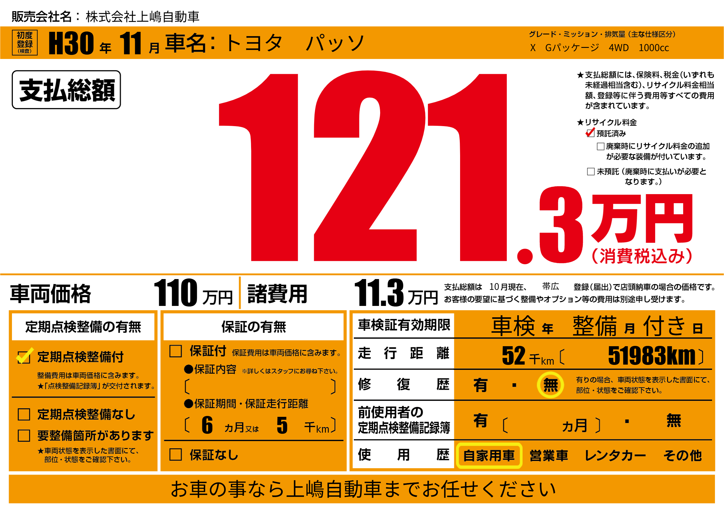| 車名 | トヨタ パッソ | グレード ミッション 排気量 |