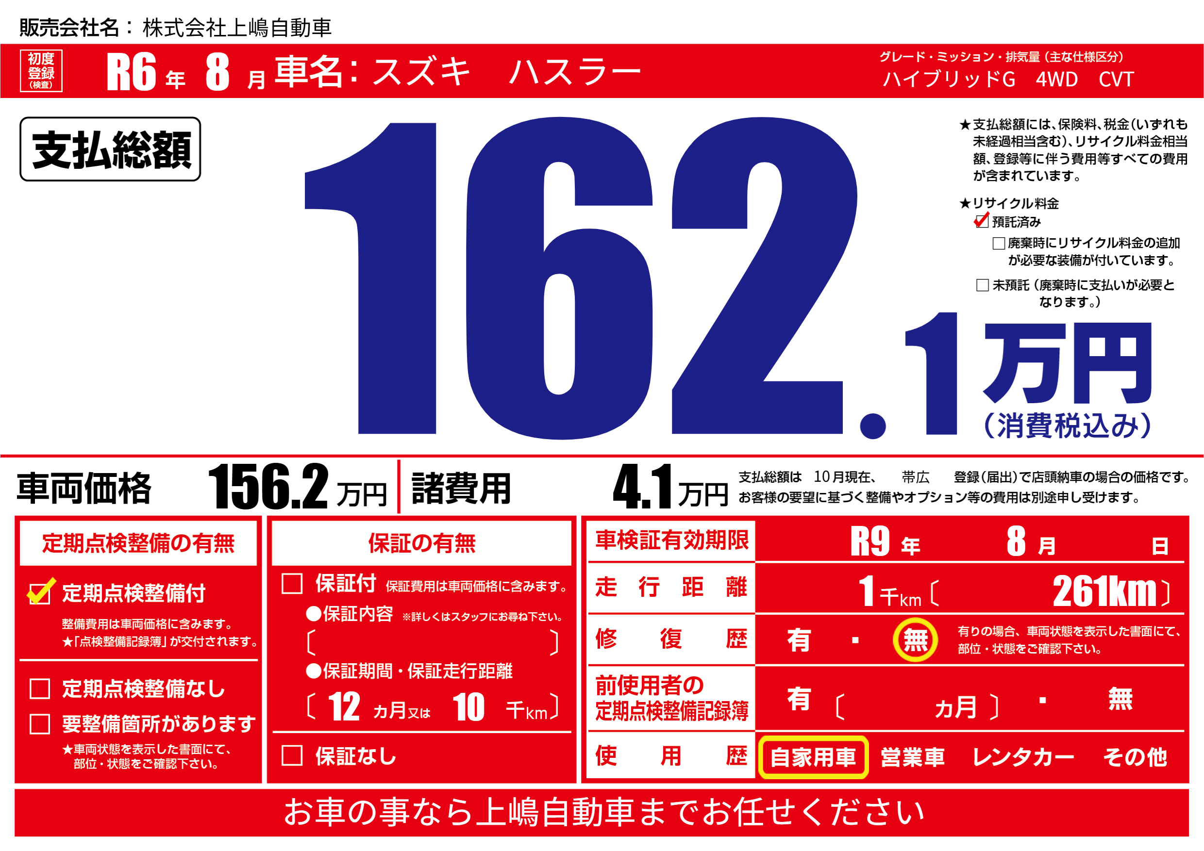 | 走行キロ | 0.1万km | 初年度登録 | R6年8月 |