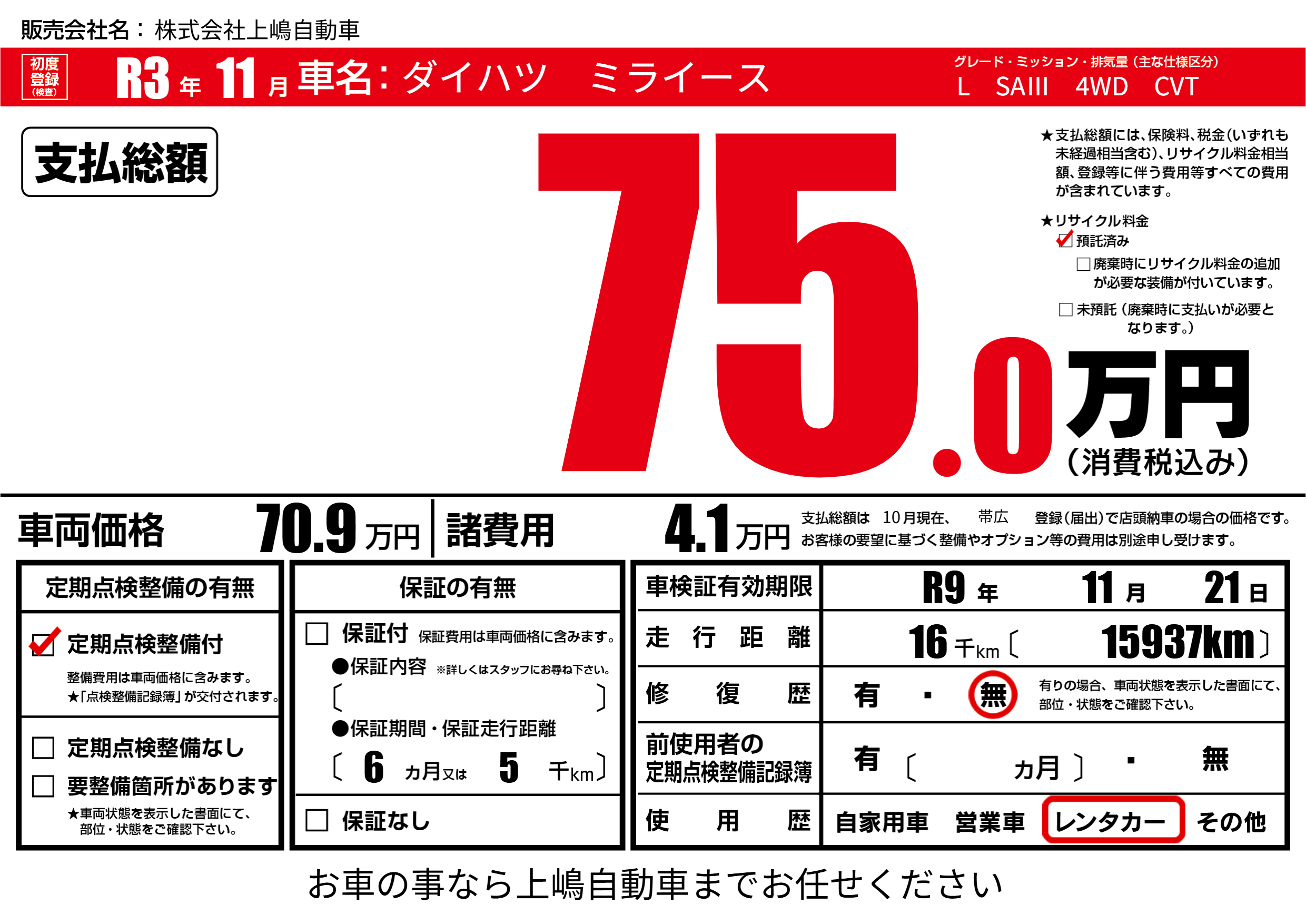 保証なし 保証内容(---) 6ヶ月または(5)千kmまで |