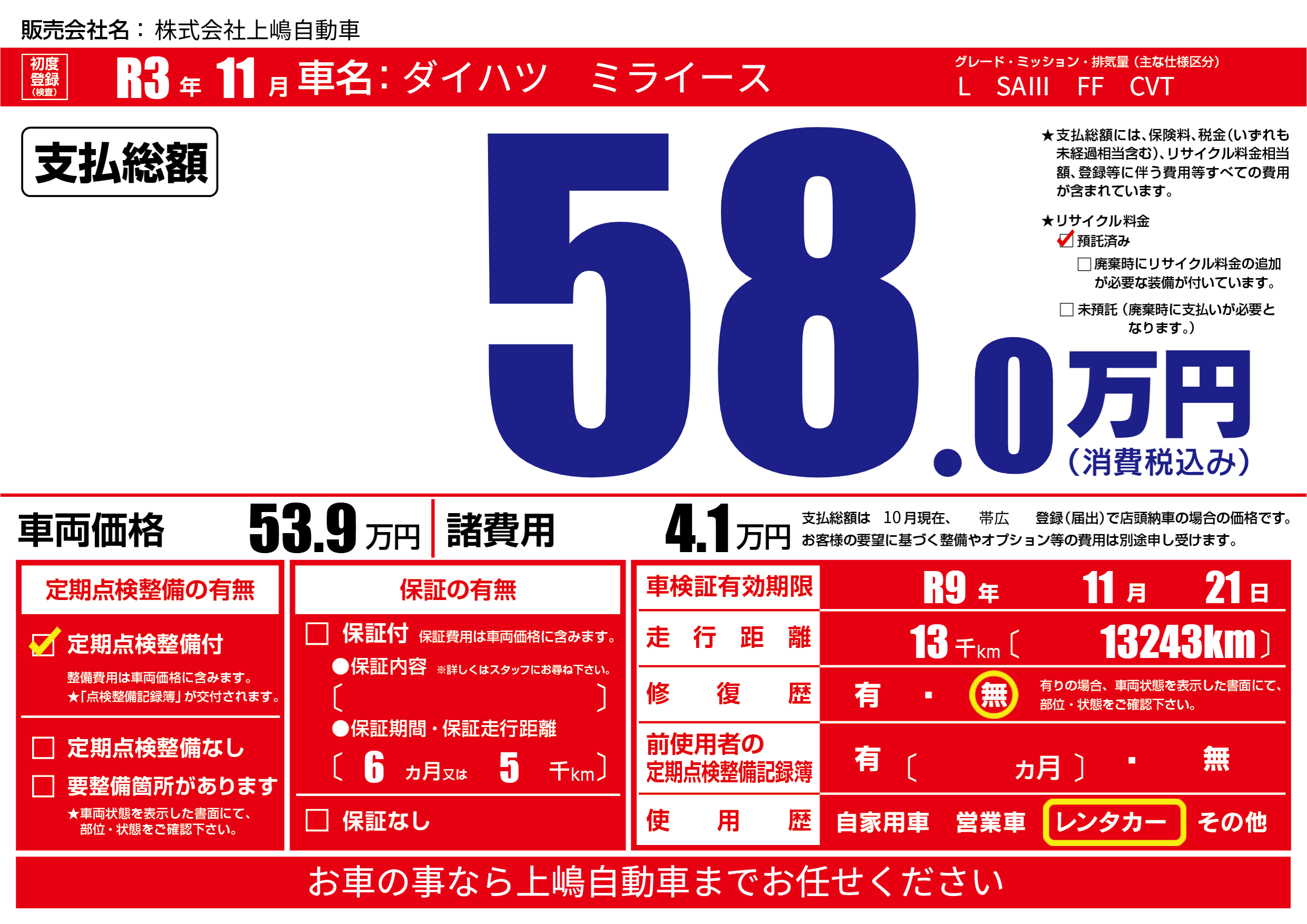 | 車検制限 | R9年 11月 21日 | ||