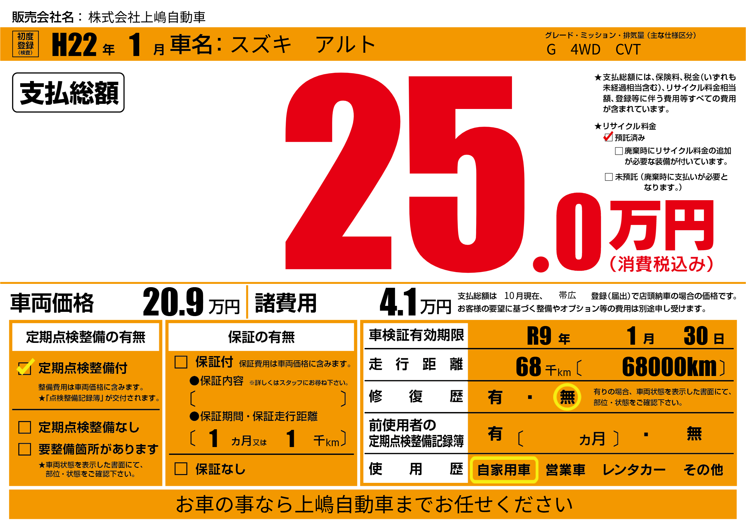 | 車名 | スズキ アルト | グレード ミッション 排気量 |