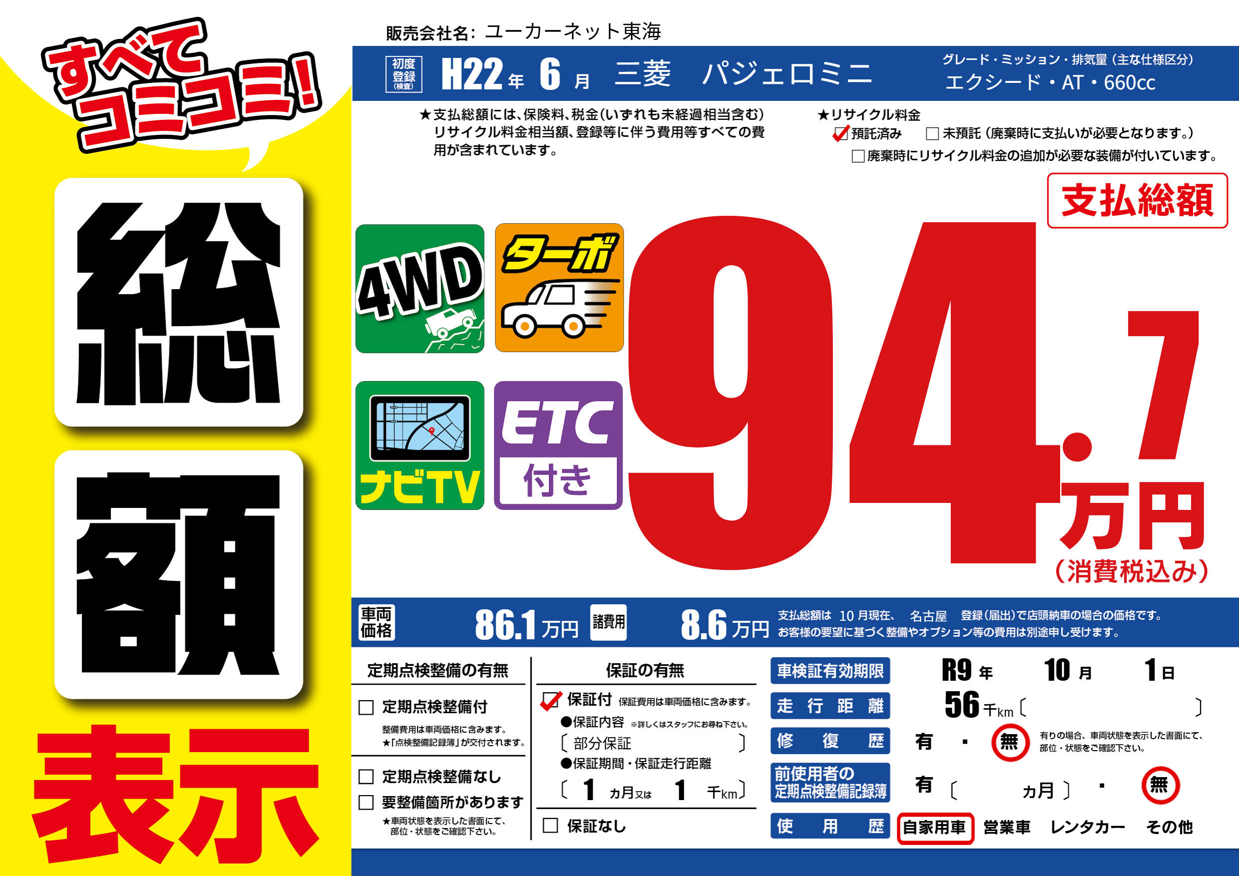 | 車名 | 三菱 パジェロミニ | グレード ミッション 排気量 |