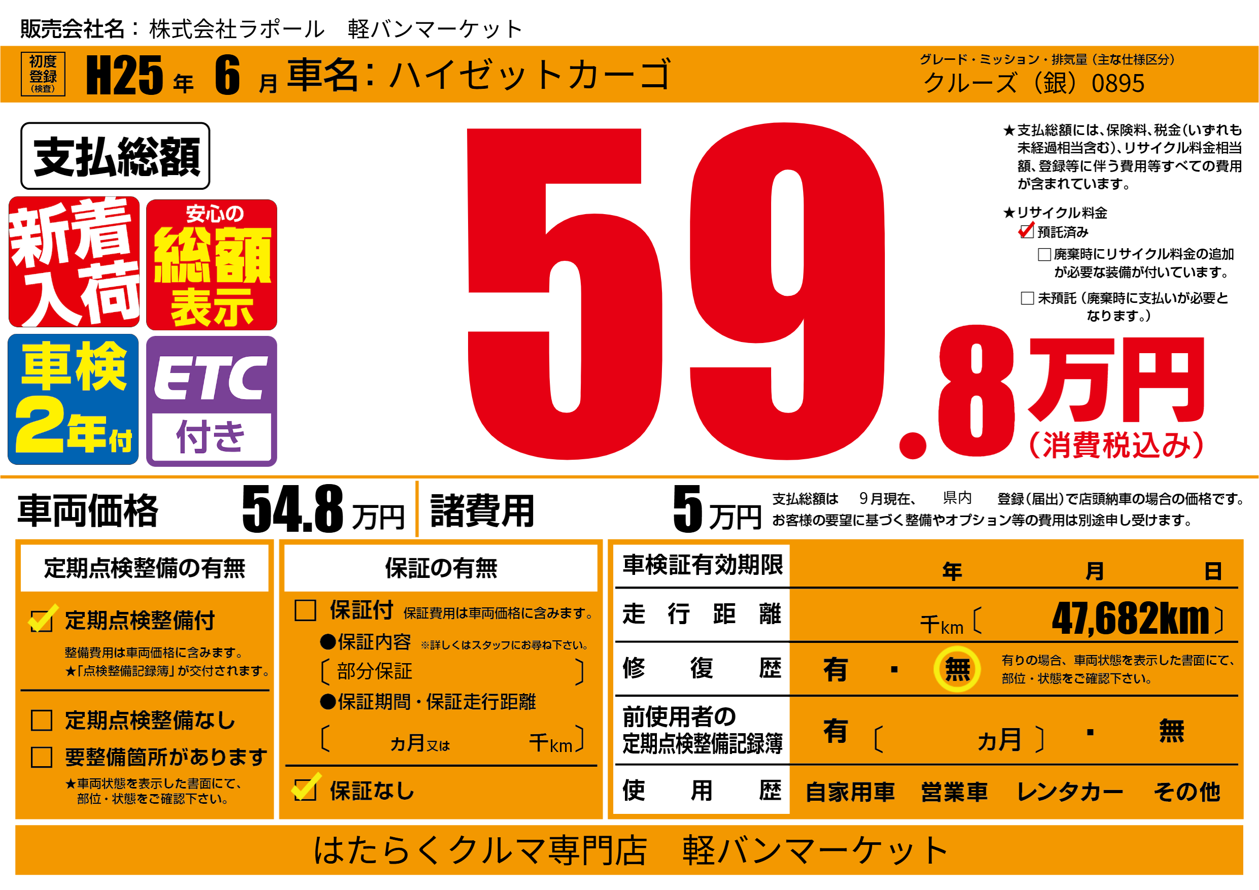 保証なし 保証内容(部分保証) ---ヶ月または()千kmまで |