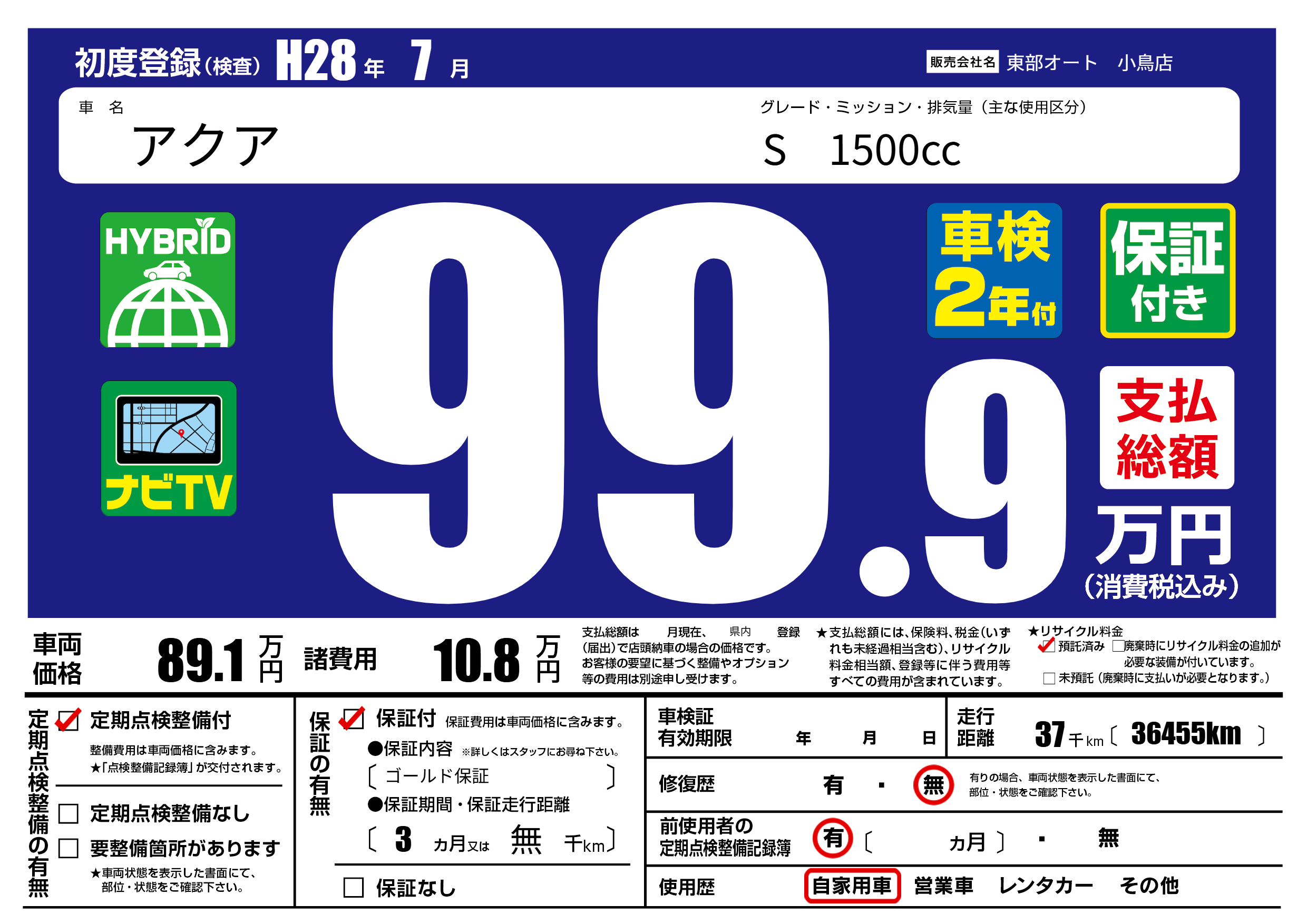 保証内容(ゴールド保証) 3ヶ月または無千km