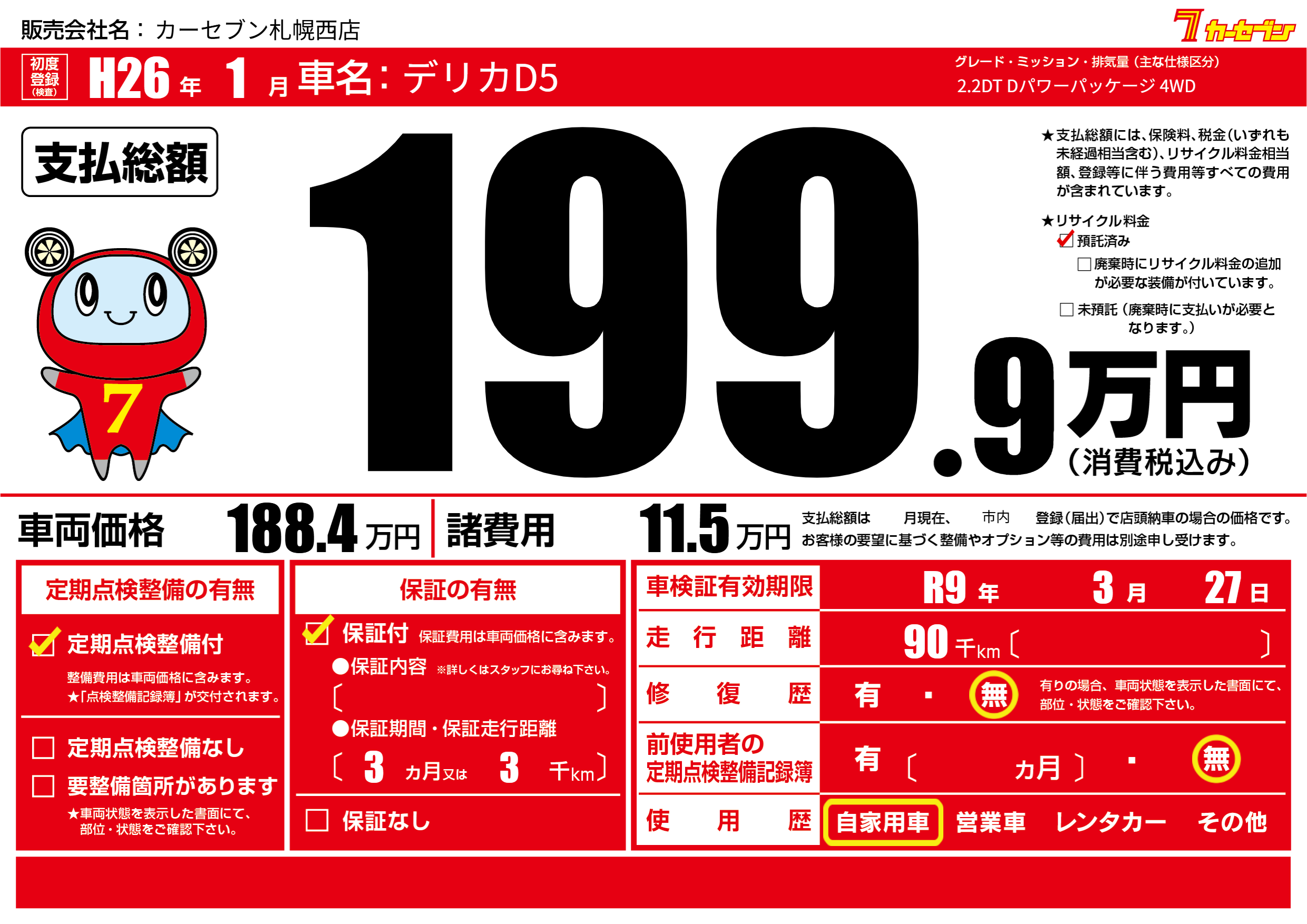 | 車名 | デリカD5 | グレード ミッション 排気量 |