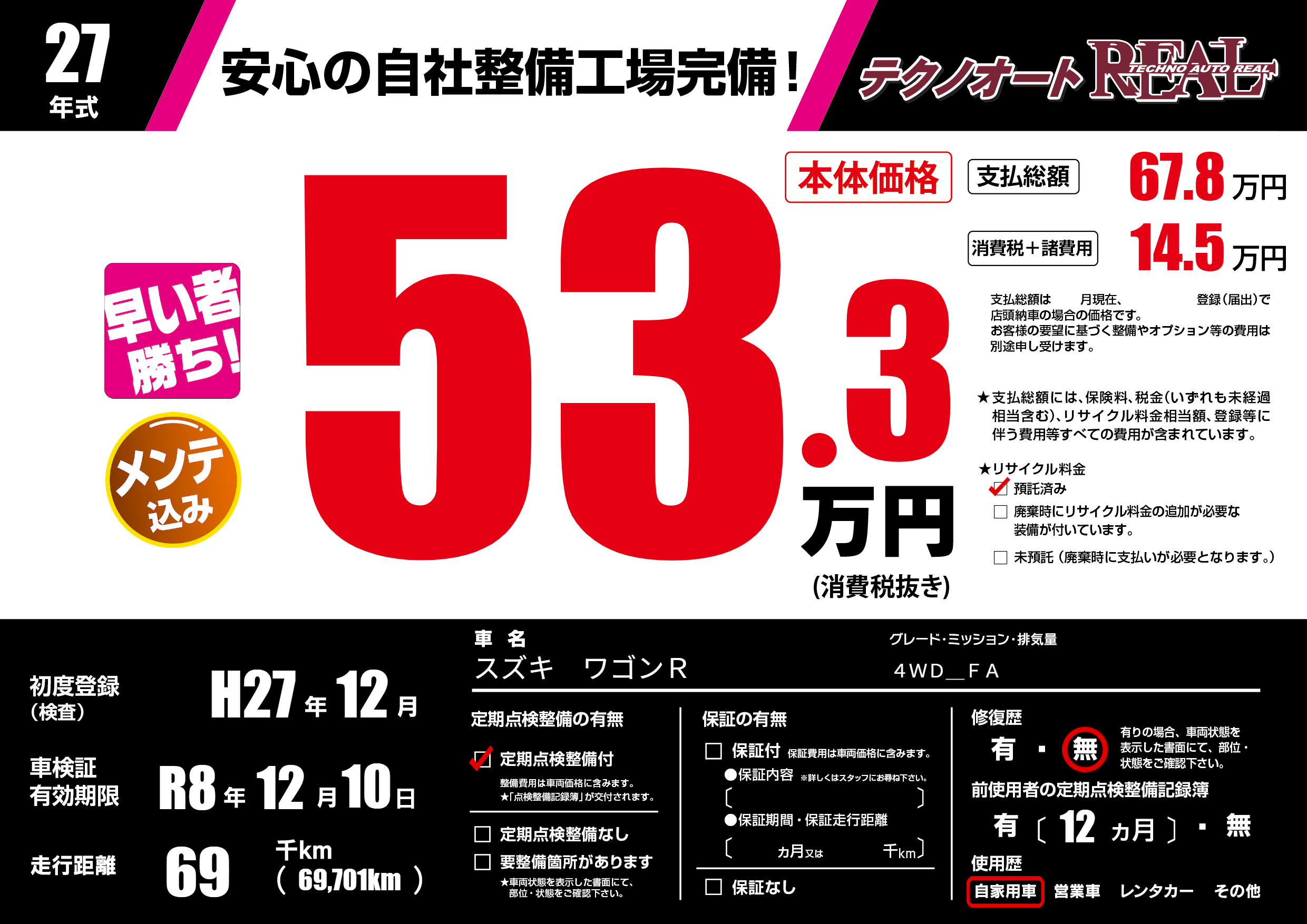 | 走行キロ | 6.9万km | 初年度登録 | H27年12月 |