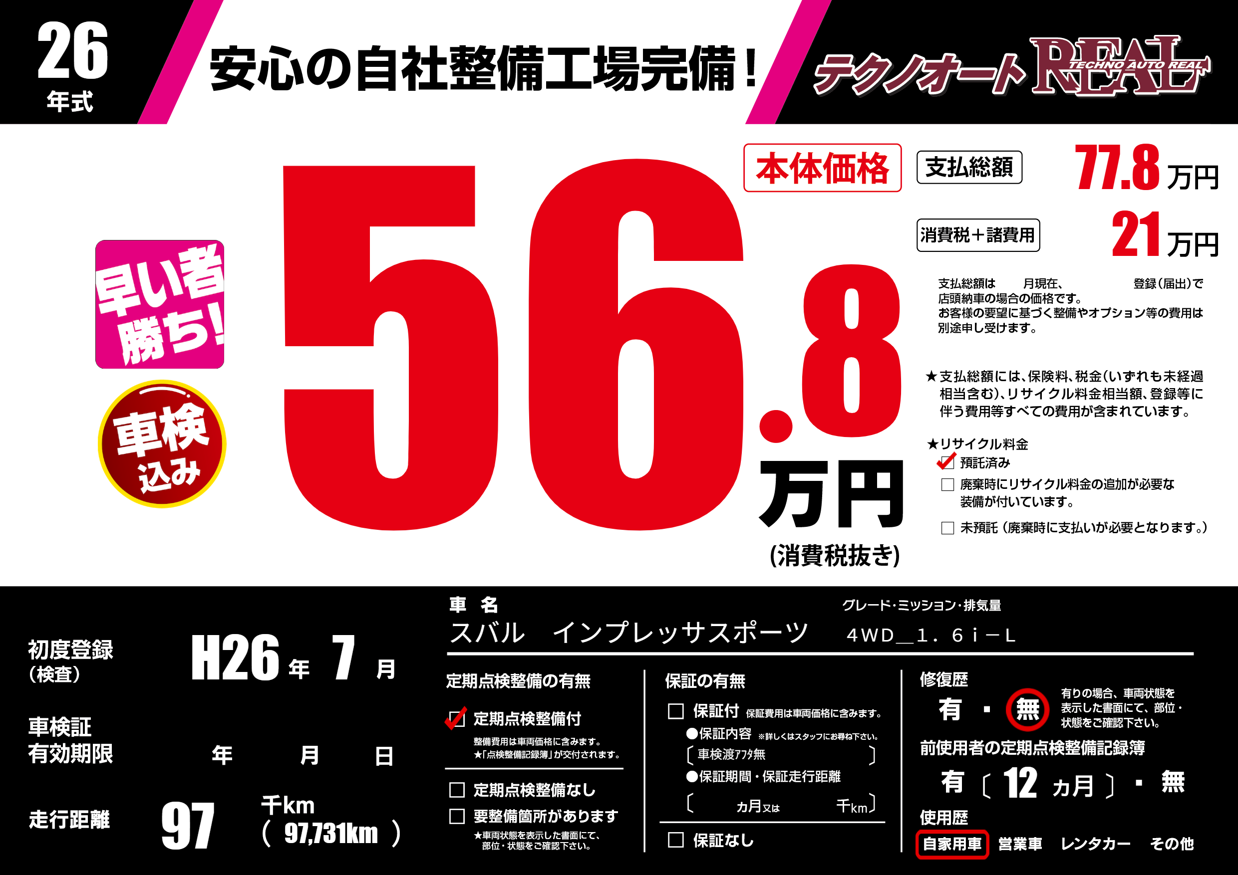 | 走行キロ | 9.7万km | 初年度登録 | H26年7月 |