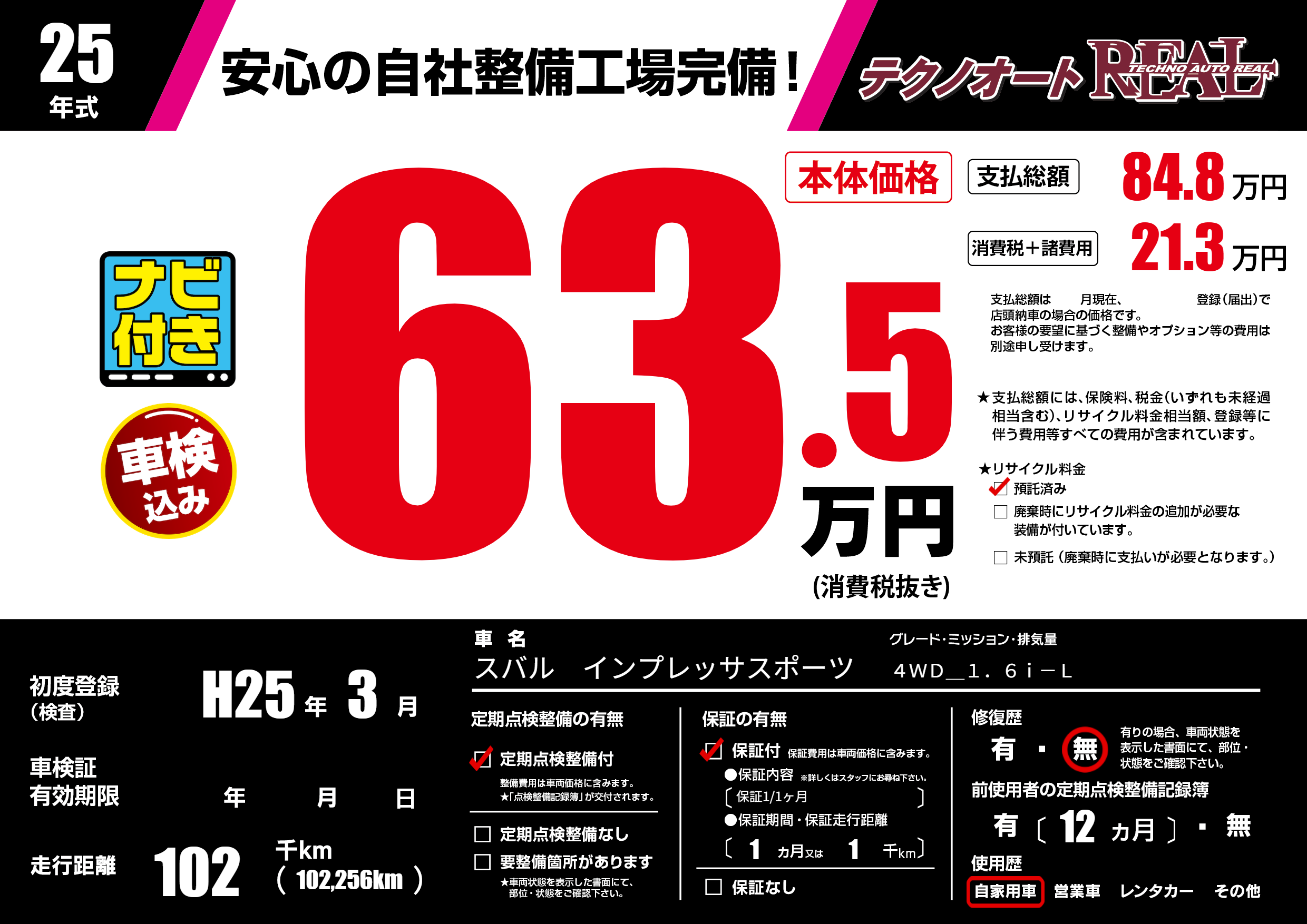 | 走行キロ | 10.2万km | 初年度登録 | H25年3月 |