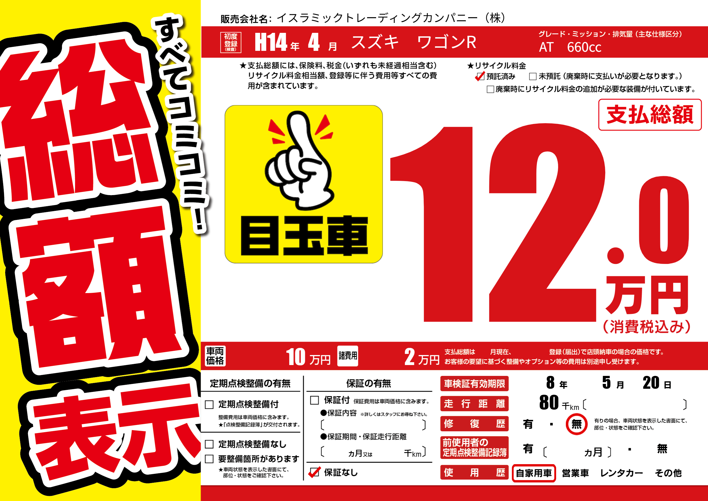 | 車名 | スズキ ワゴンR | グレード ミッション 排気量 |