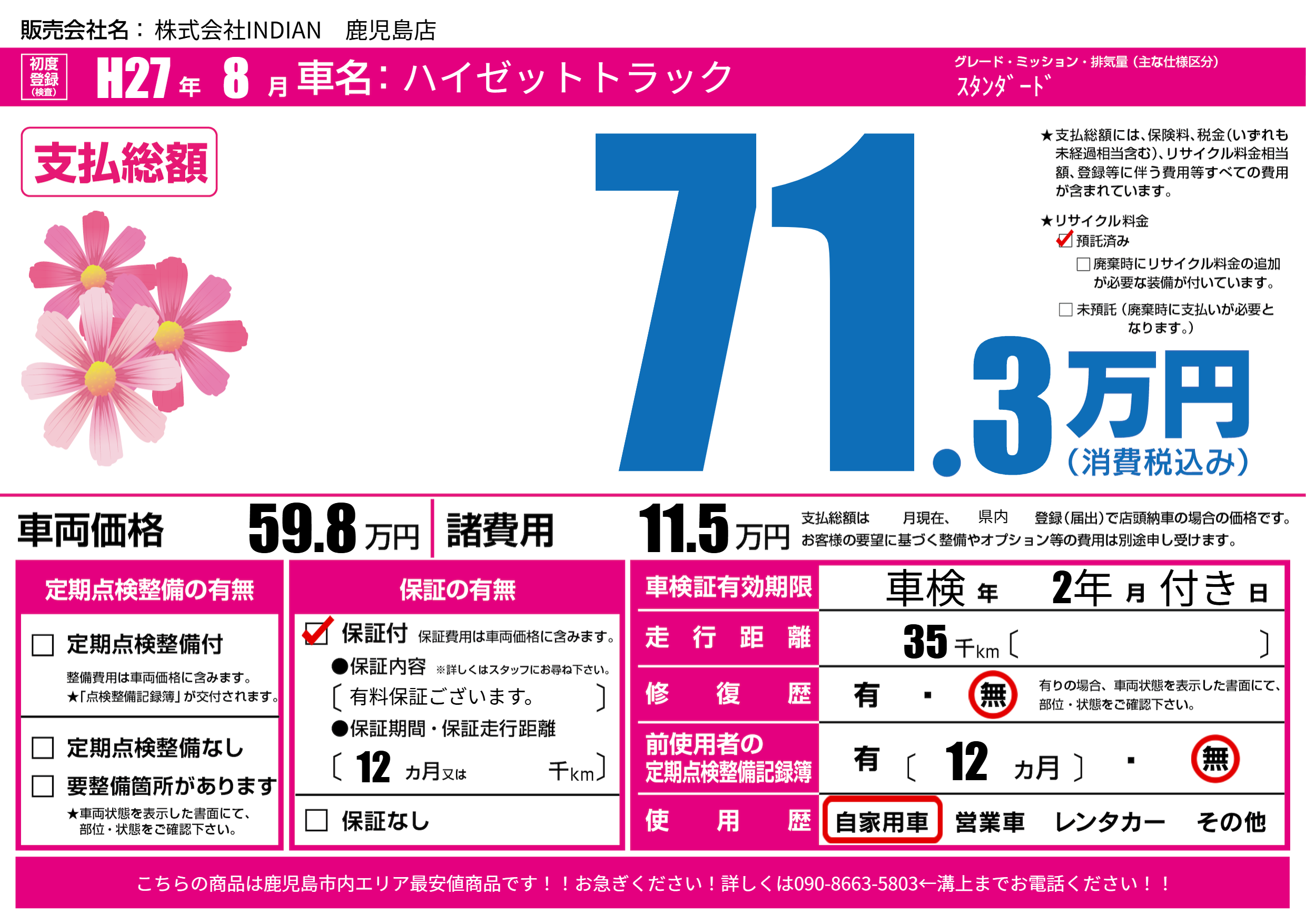 | 走行キロ | 3.5万km | 初年度登録 | H27年8月 |