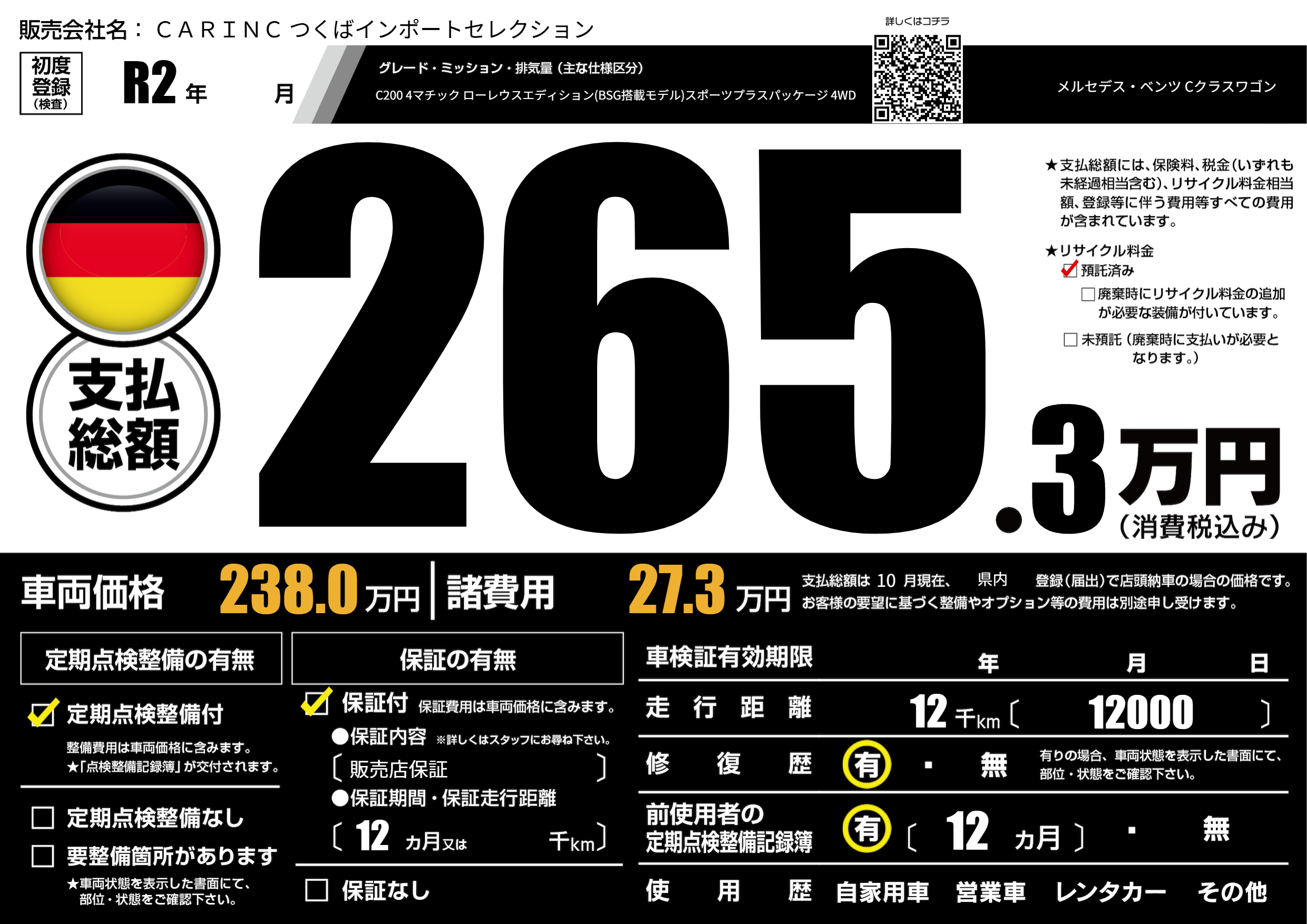 | 車名 | メルセデス・ベンツ Cクラスワゴン | グレード ミッション 排気量 |