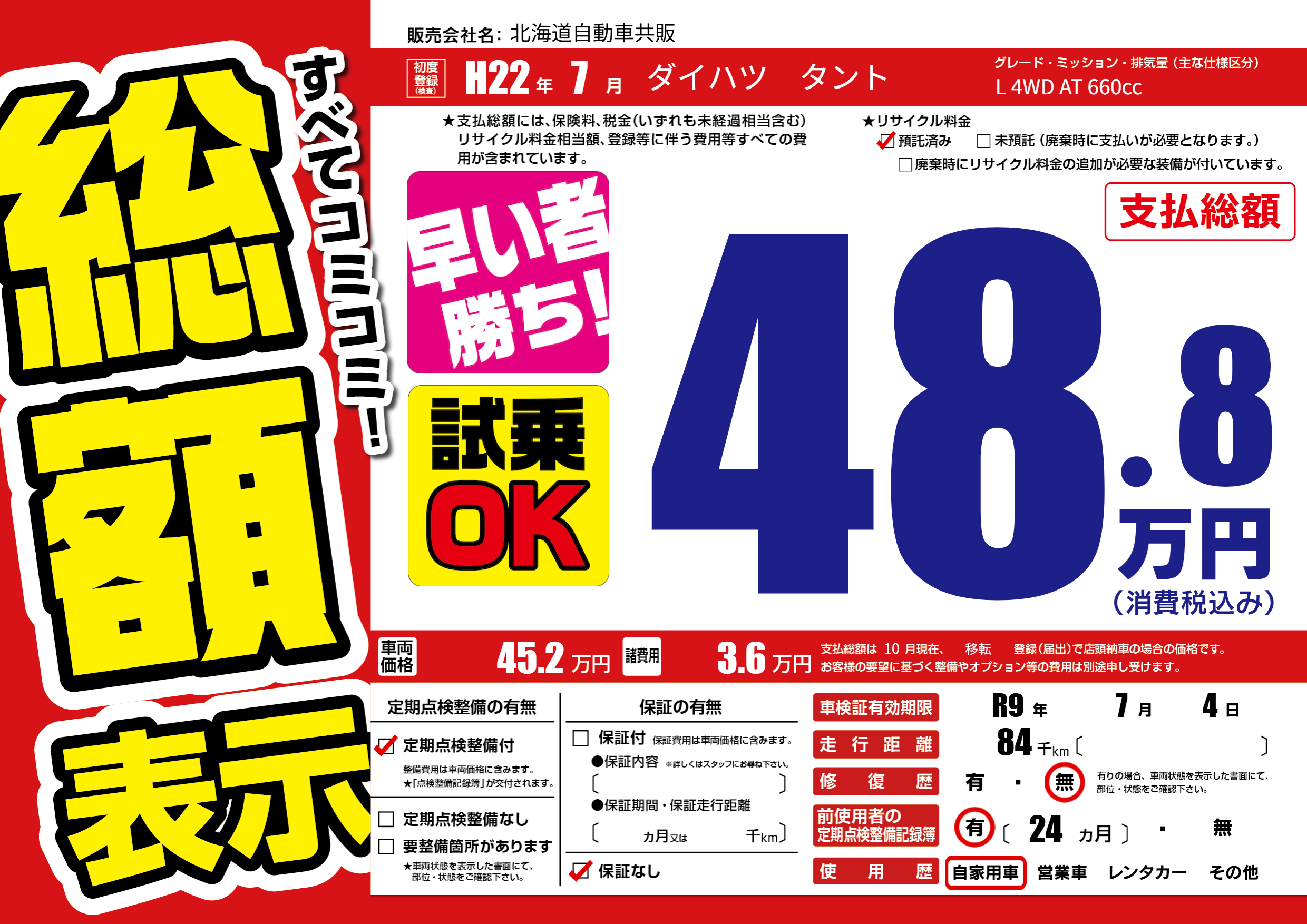 | 車名 | ダイハツ タント | グレード ミッション 排気量 |