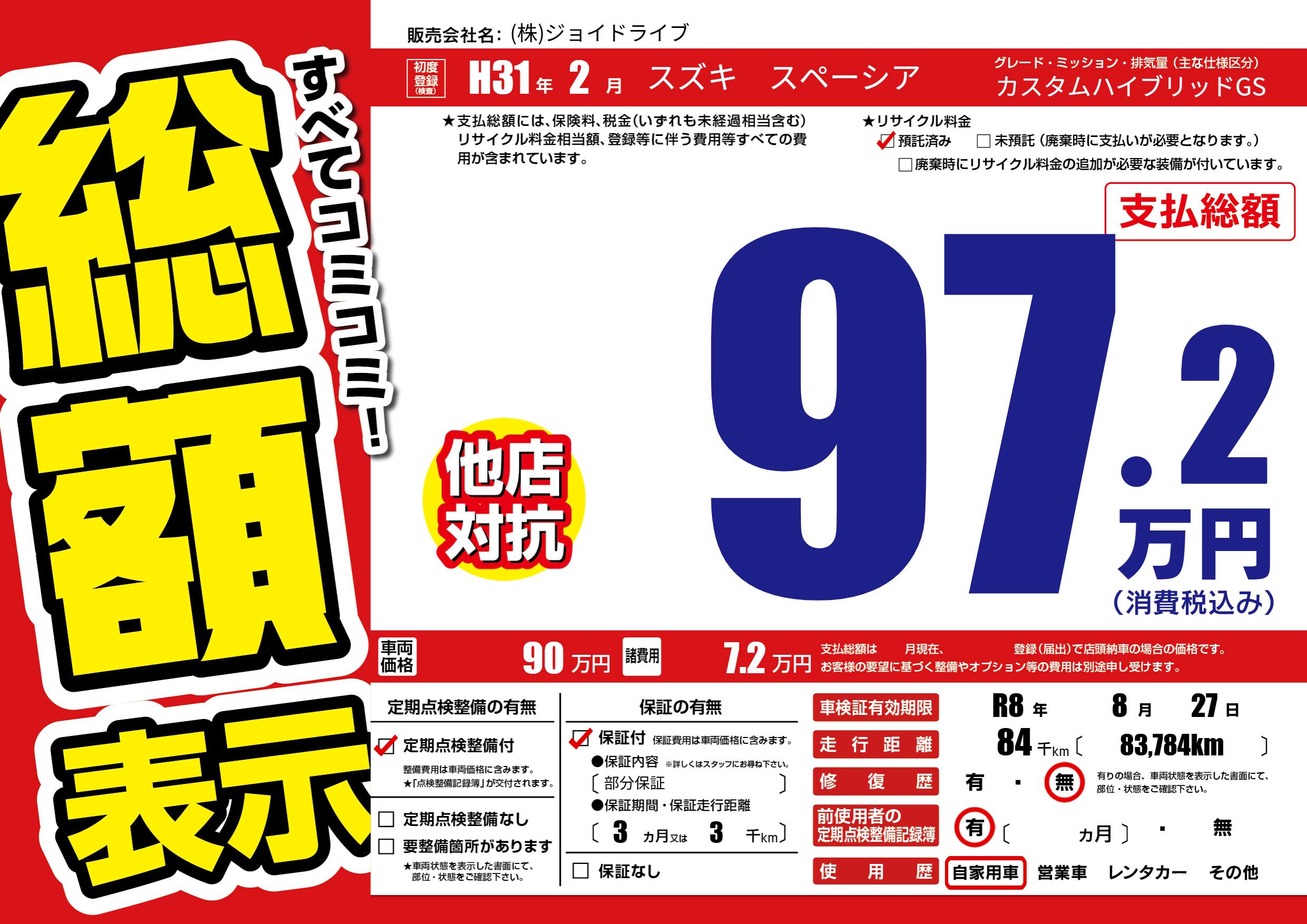 | 車名 | スズキ スペーシア | グレード ミッション 排気量 |