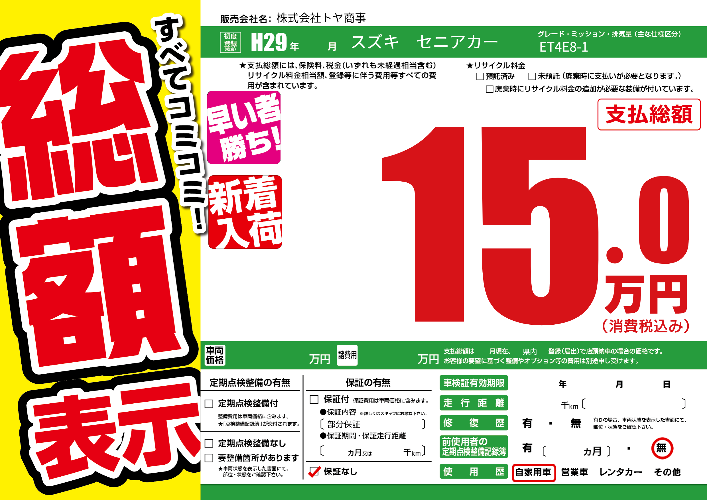 保証なし 保証内容(部分保証) ---ヶ月または()千kmまで |