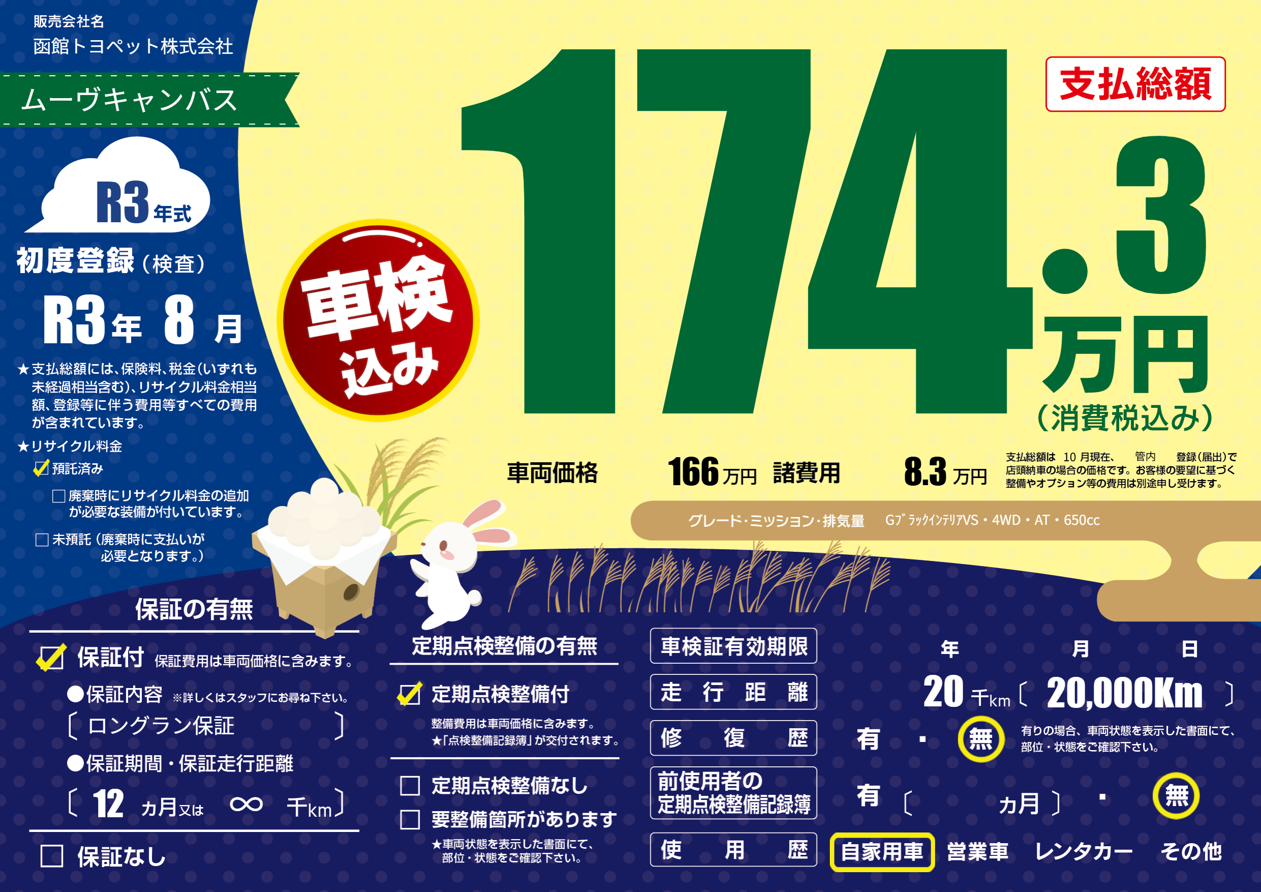 | 走行キロ | 2万km | 初年度登録 | R3年8月 |