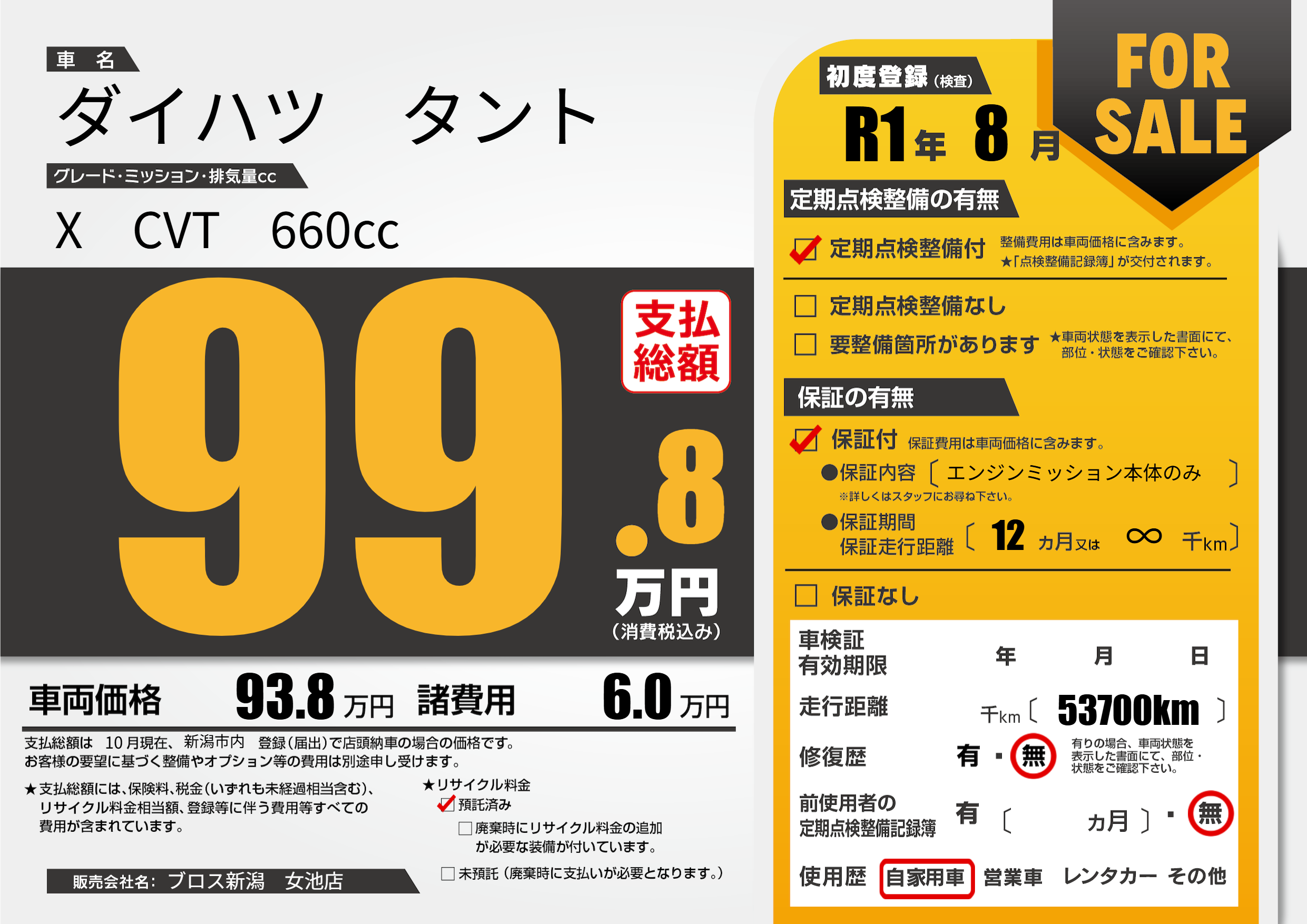 | 車名 | ダイハツ タント | グレード ミッション 排気量 |