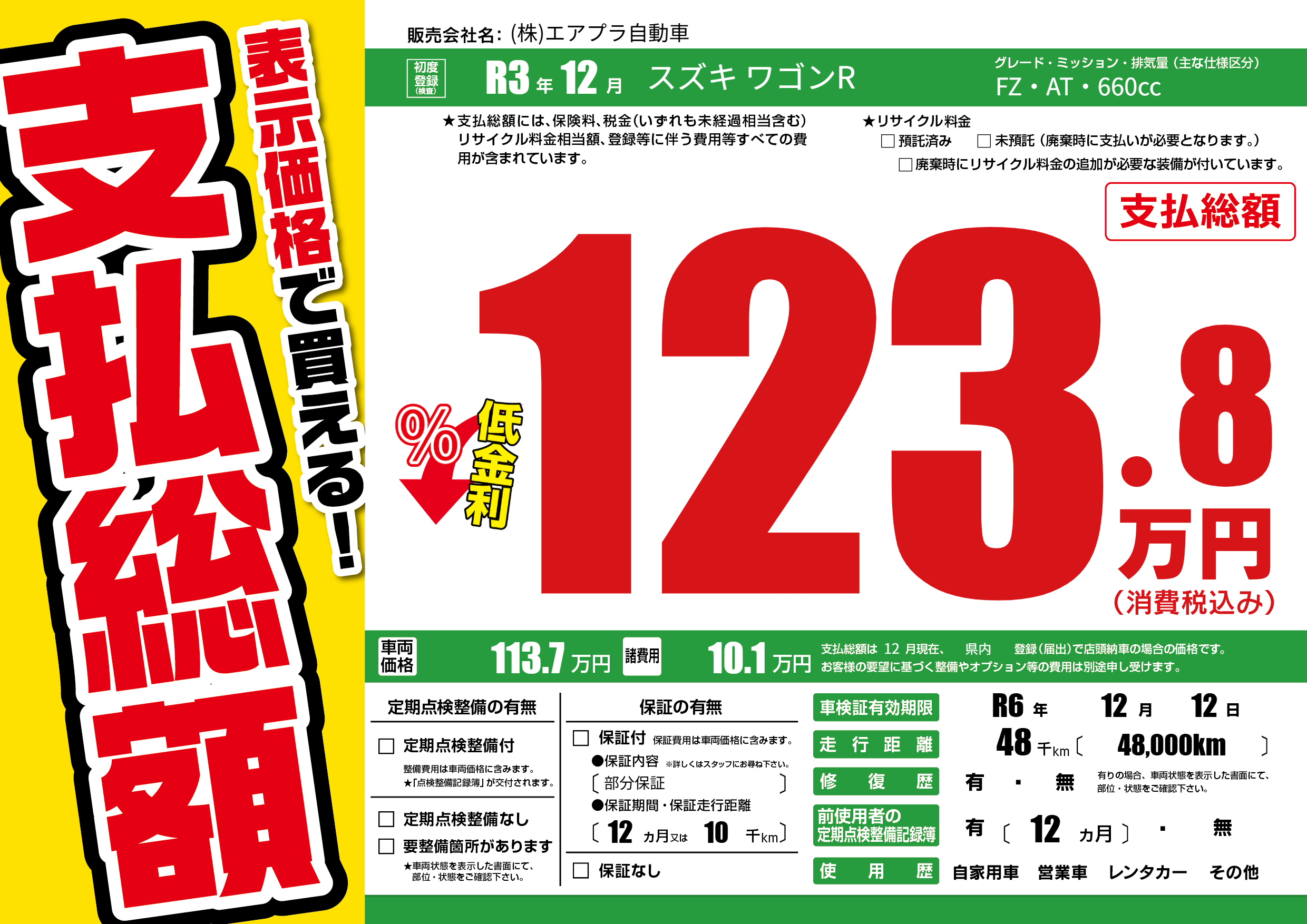 | 走行キロ | 4.8万km | 初年度登録 | R3年12月 |