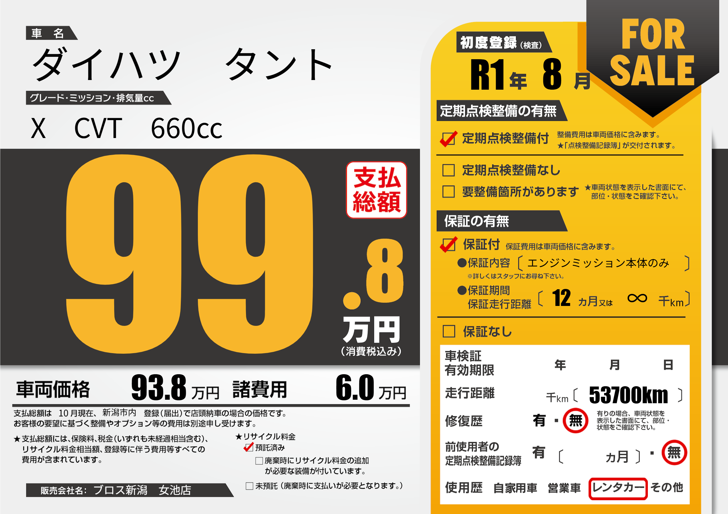 | 車名 | ダイハツ タント | グレード ミッション 排気量 |
