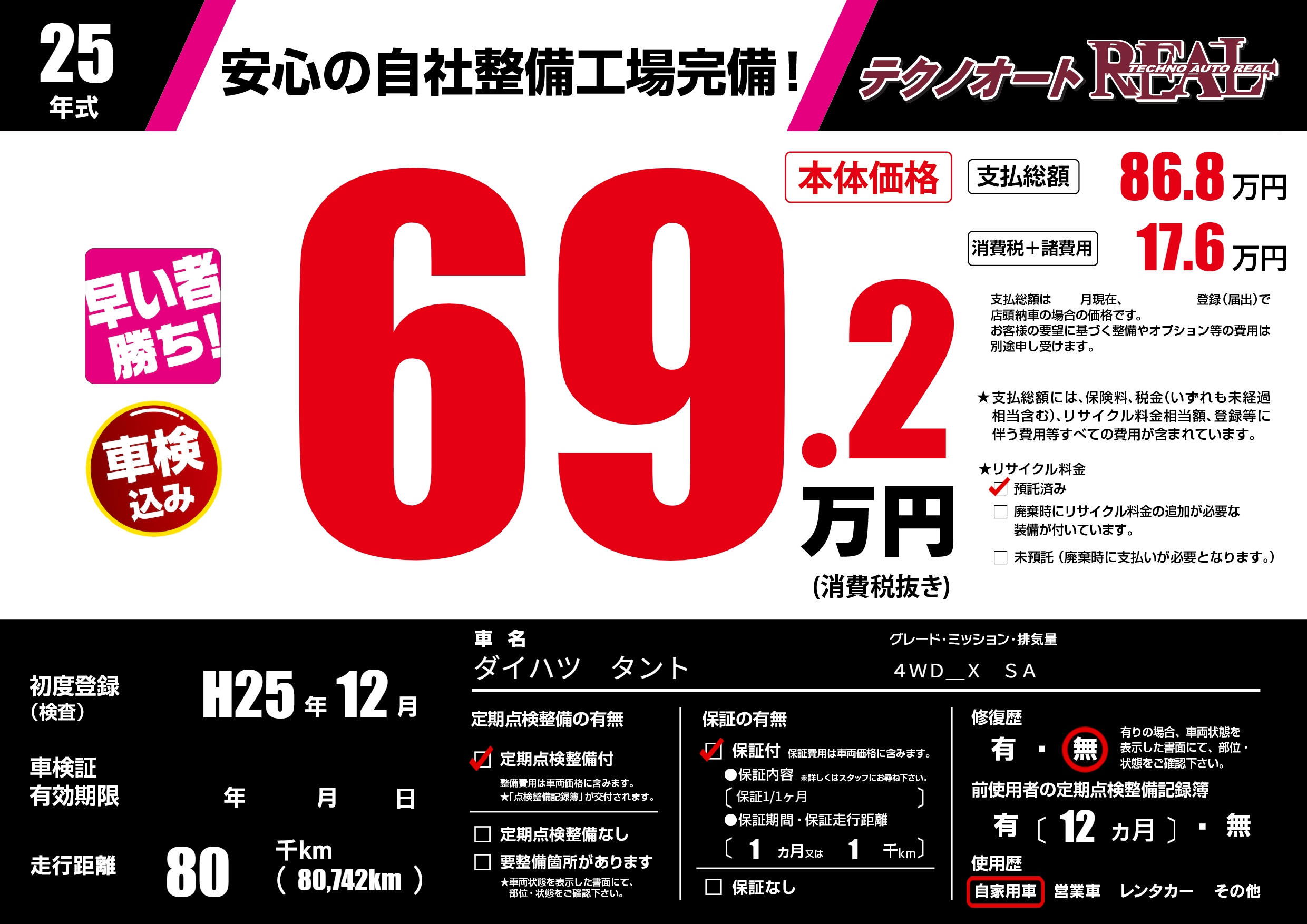| 車名 | ダイハツ タント | グレード ミッション 排気量 |