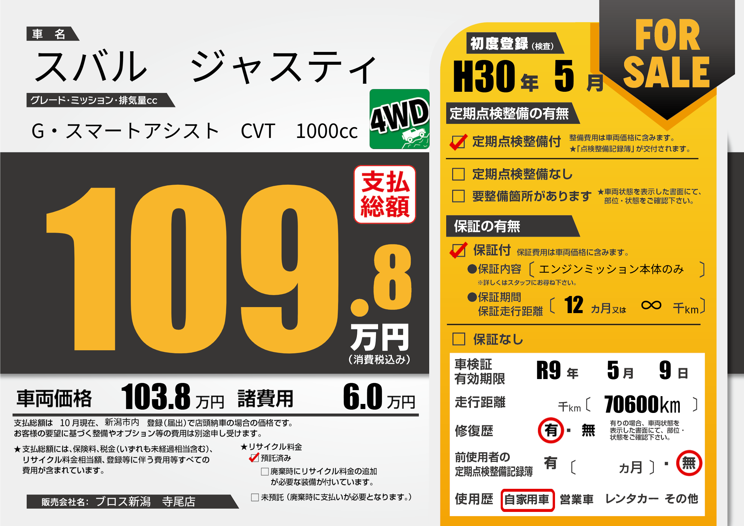 | 車名 | スバル ジャスティ | グレード ミッション 排気量 |