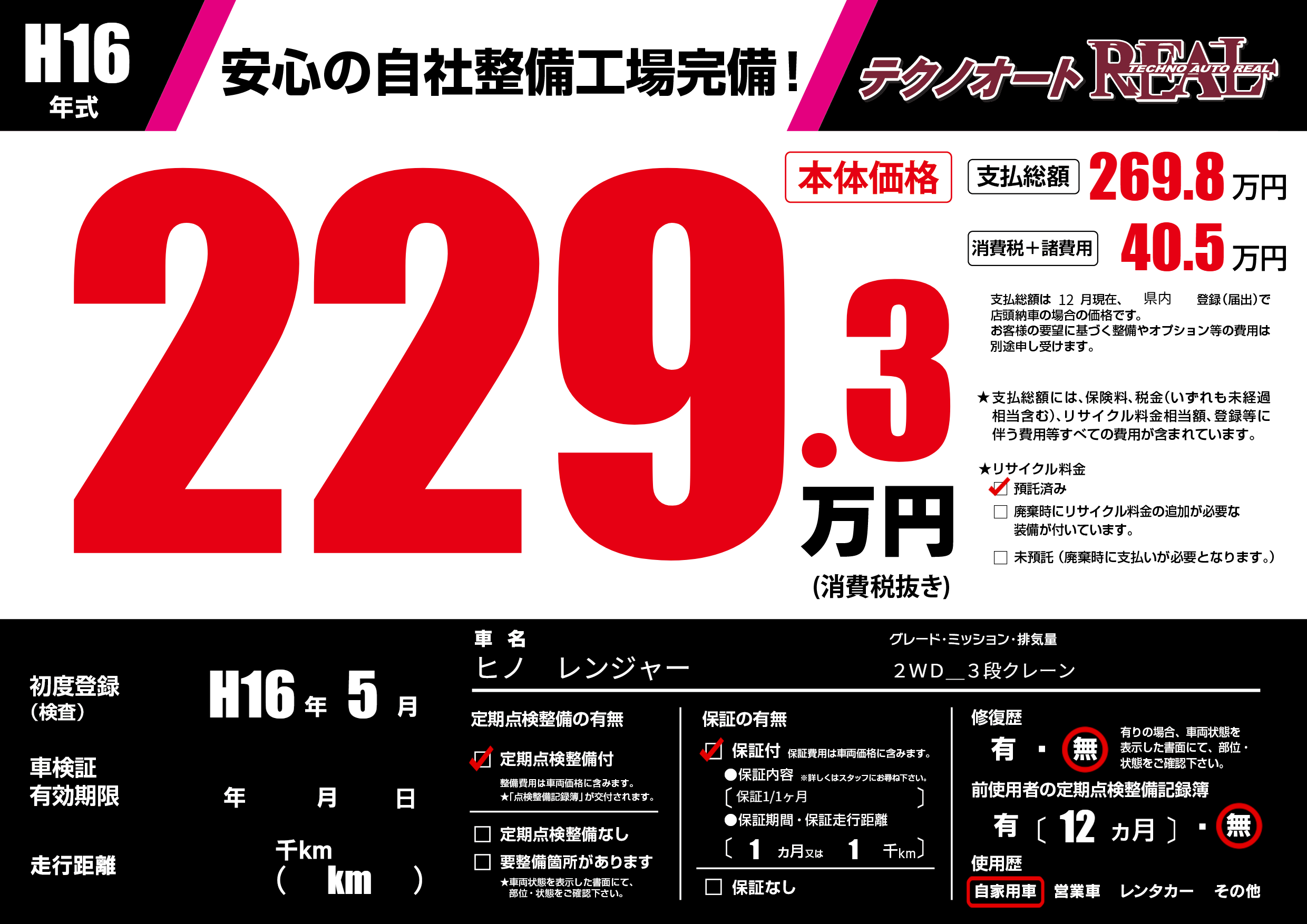 | 車名 | ヒノ レンジャー | グレード ミッション 排気量 |