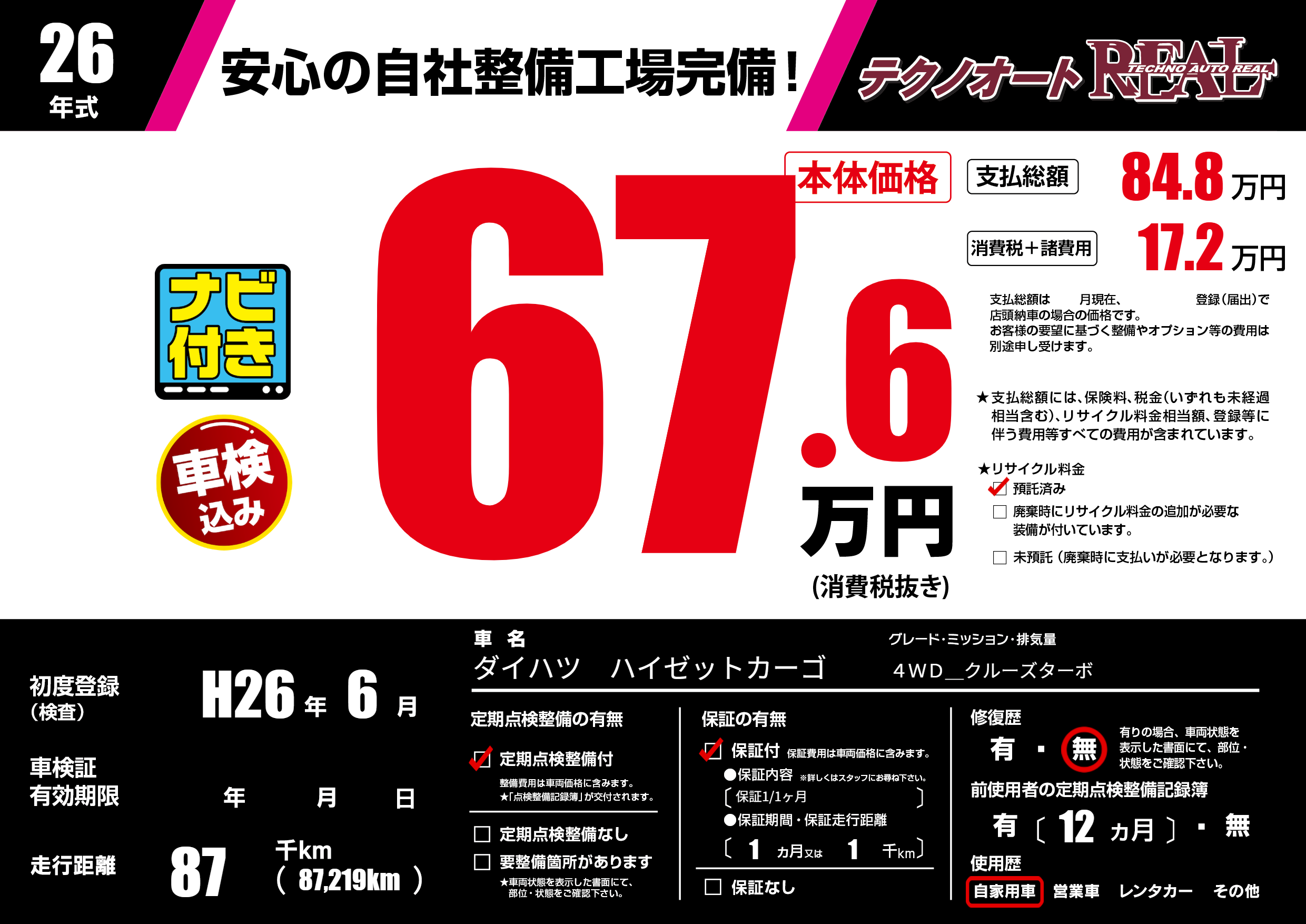 | 走行キロ | 8.7万km | 初年度登録 | H26年6月 |