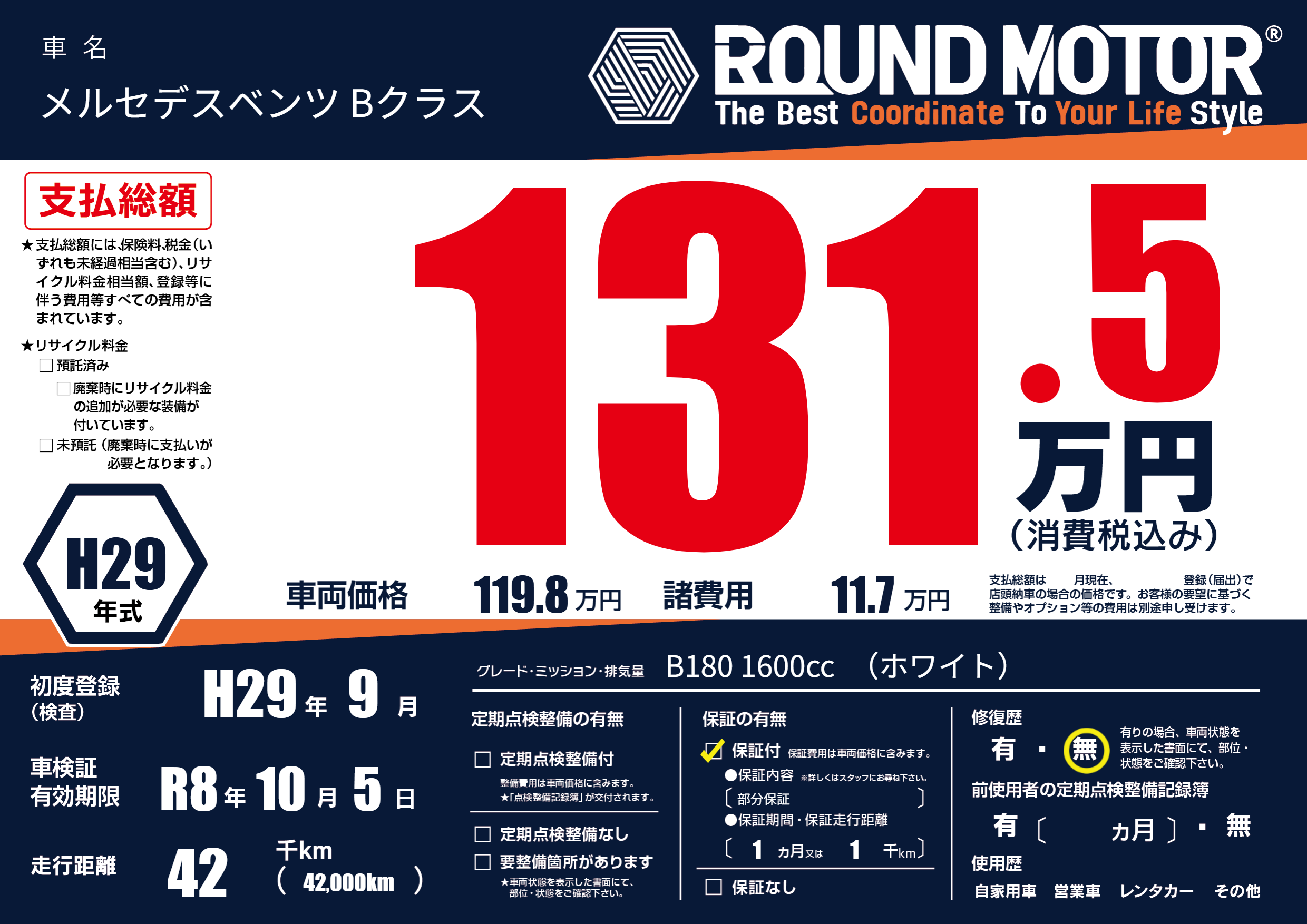| 車名 | メルセデスベンツ Bクラス | グレード ミッション 排気量 |