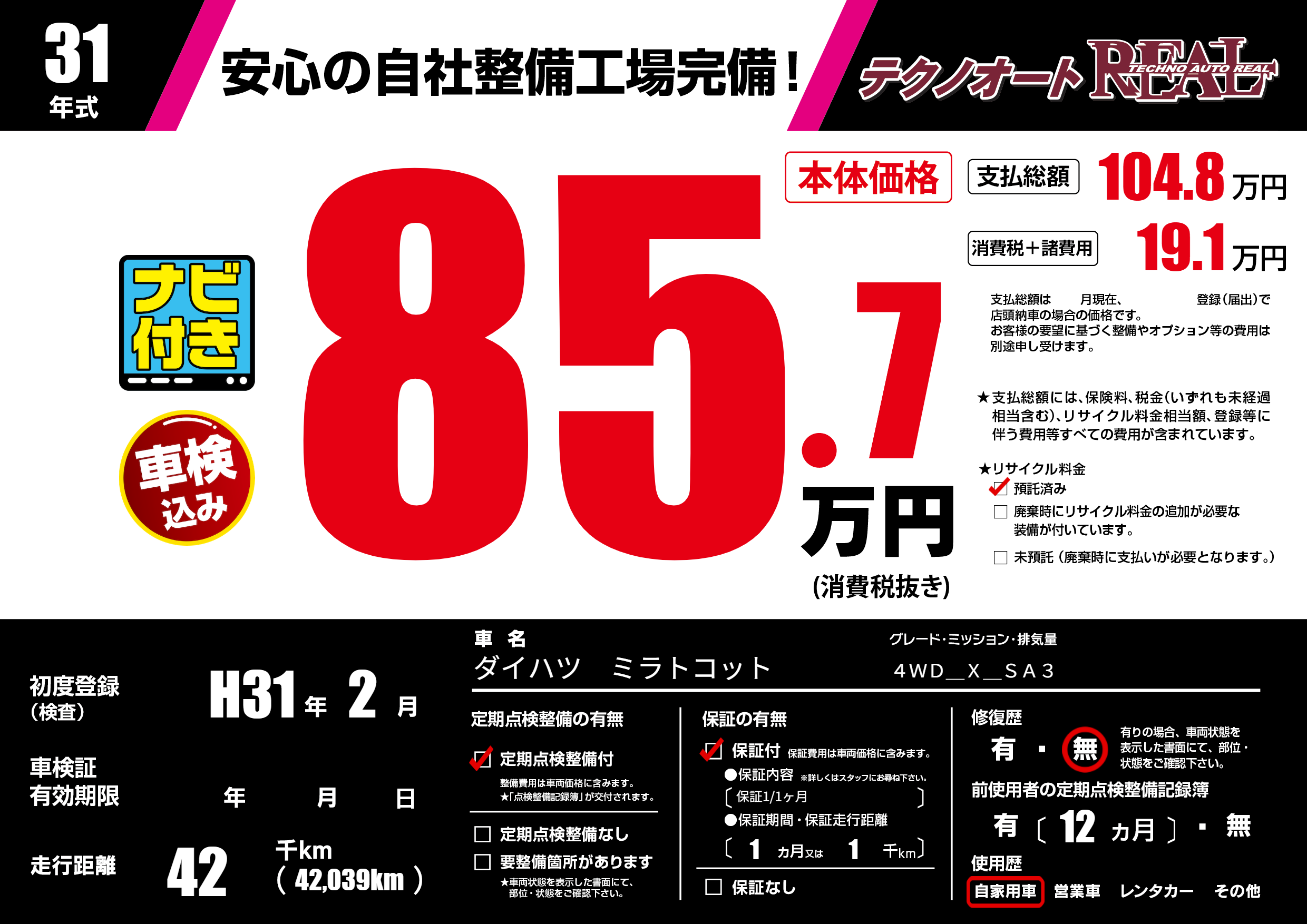 | 走行キロ | 4.2万km | 初年度登録 | H31年2月 |
