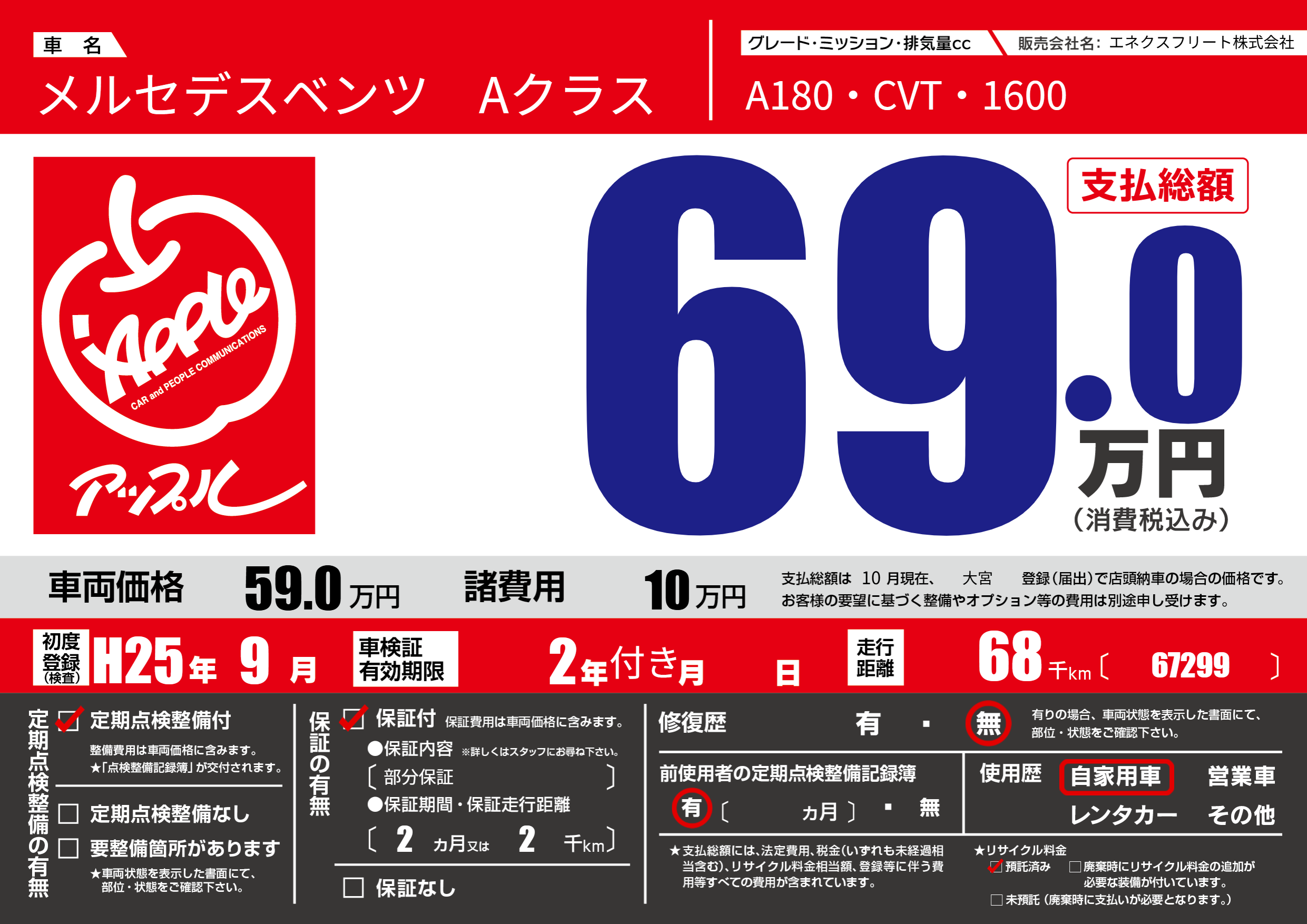| 車名 | メルセデスベンツ Aクラス | グレード ミッション 排気量 |