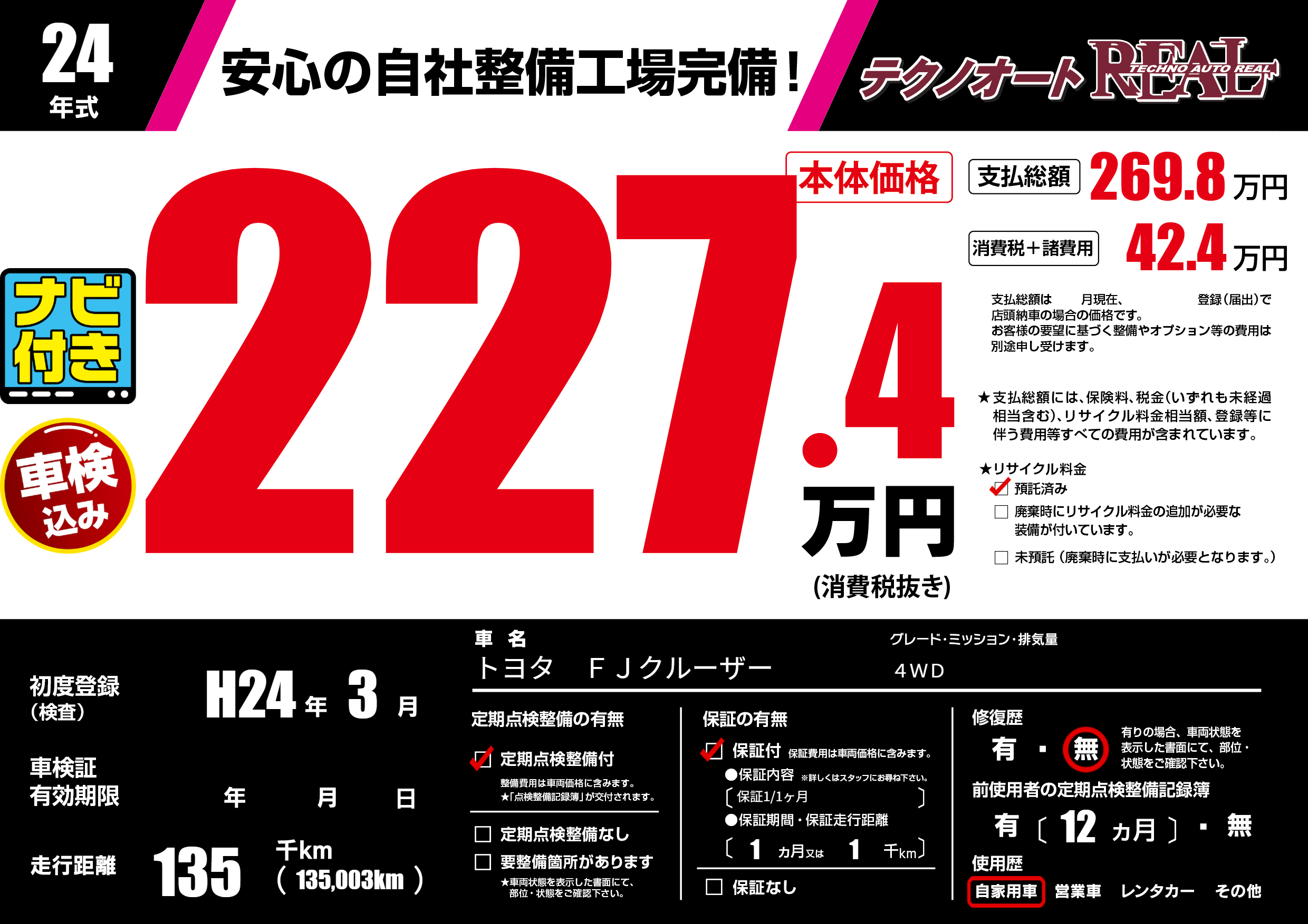 | 走行キロ | 13.5万km | 初年度登録 | H24年3月 |