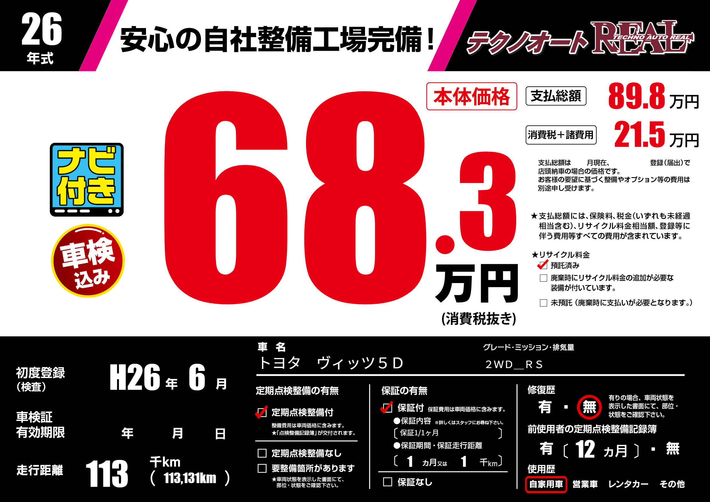 | 走行キロ | 11.3万km | 初年度登録 | H26年6月 |
