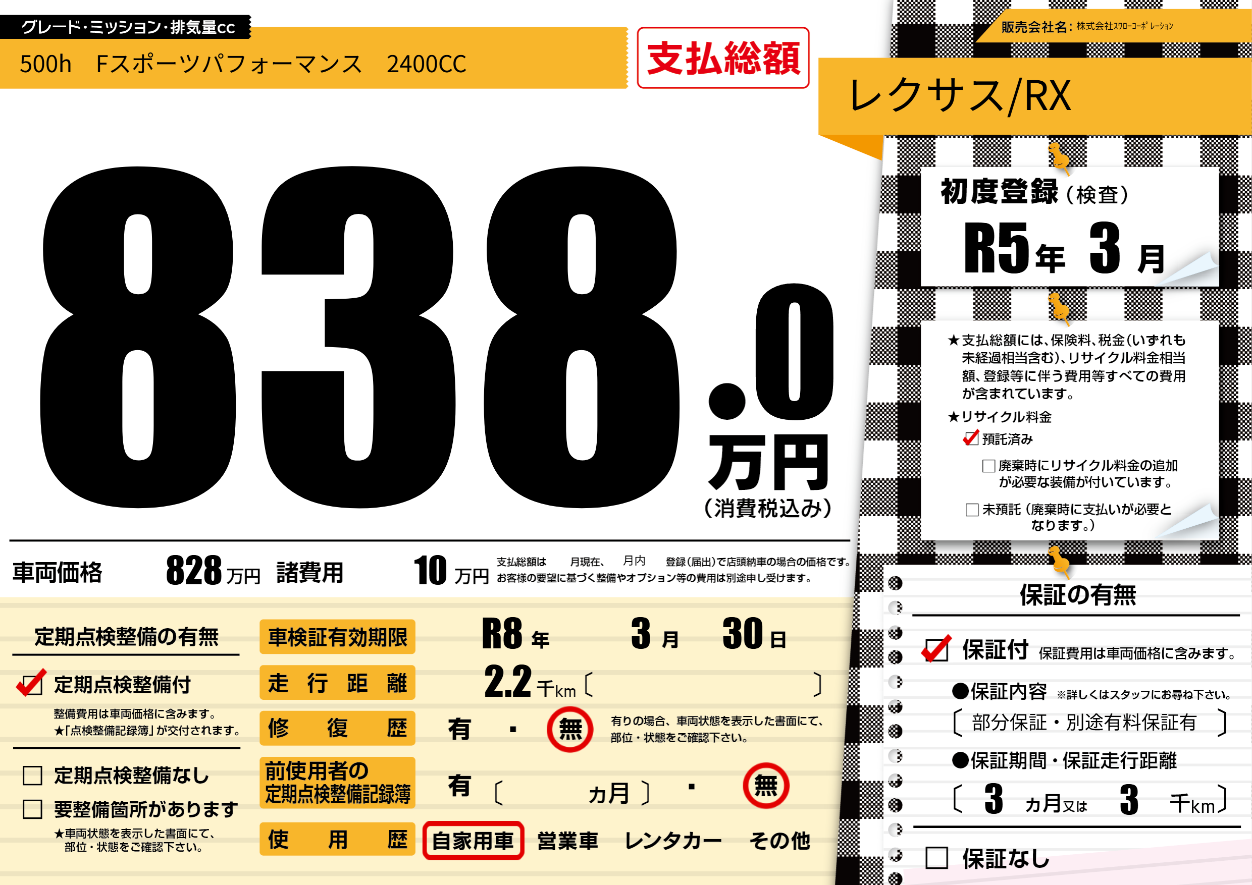 | 車名 | レクサス/RX | グレード ミッション 排気量 |