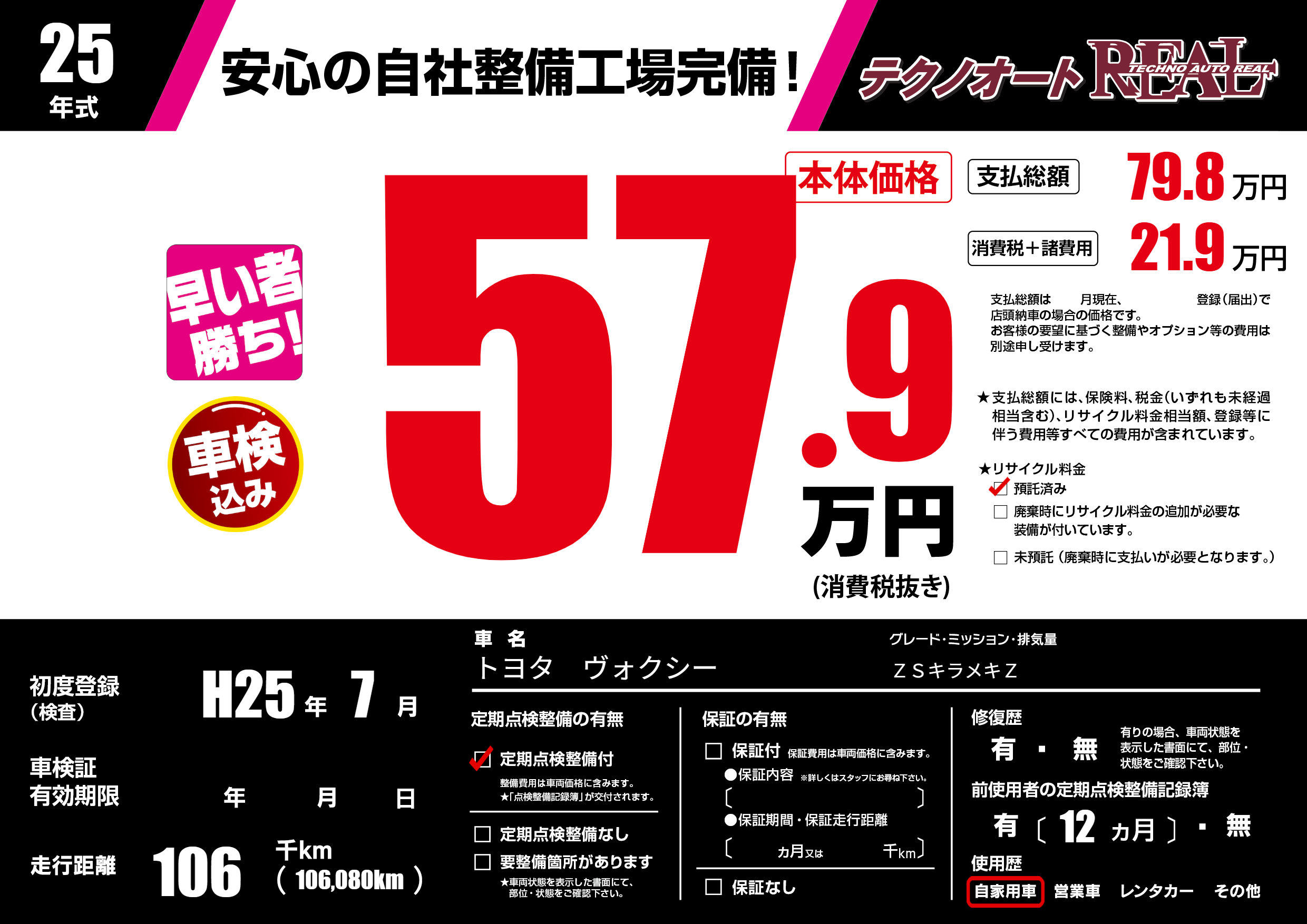 | 走行キロ | 10.6万km | 初年度登録 | H25年7月 |