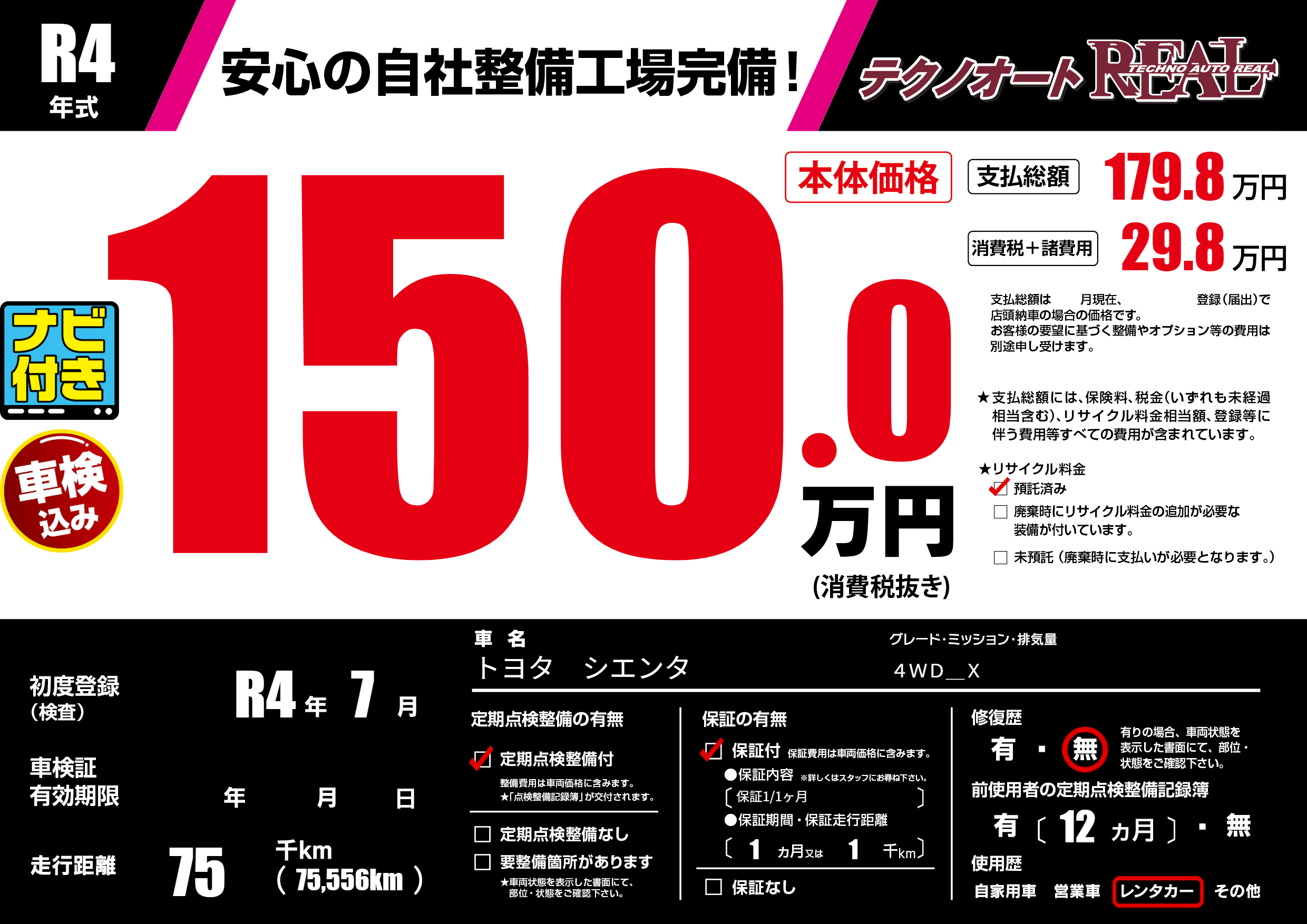| 走行キロ | 7.5万km | 初年度登録 | R4年7月 |