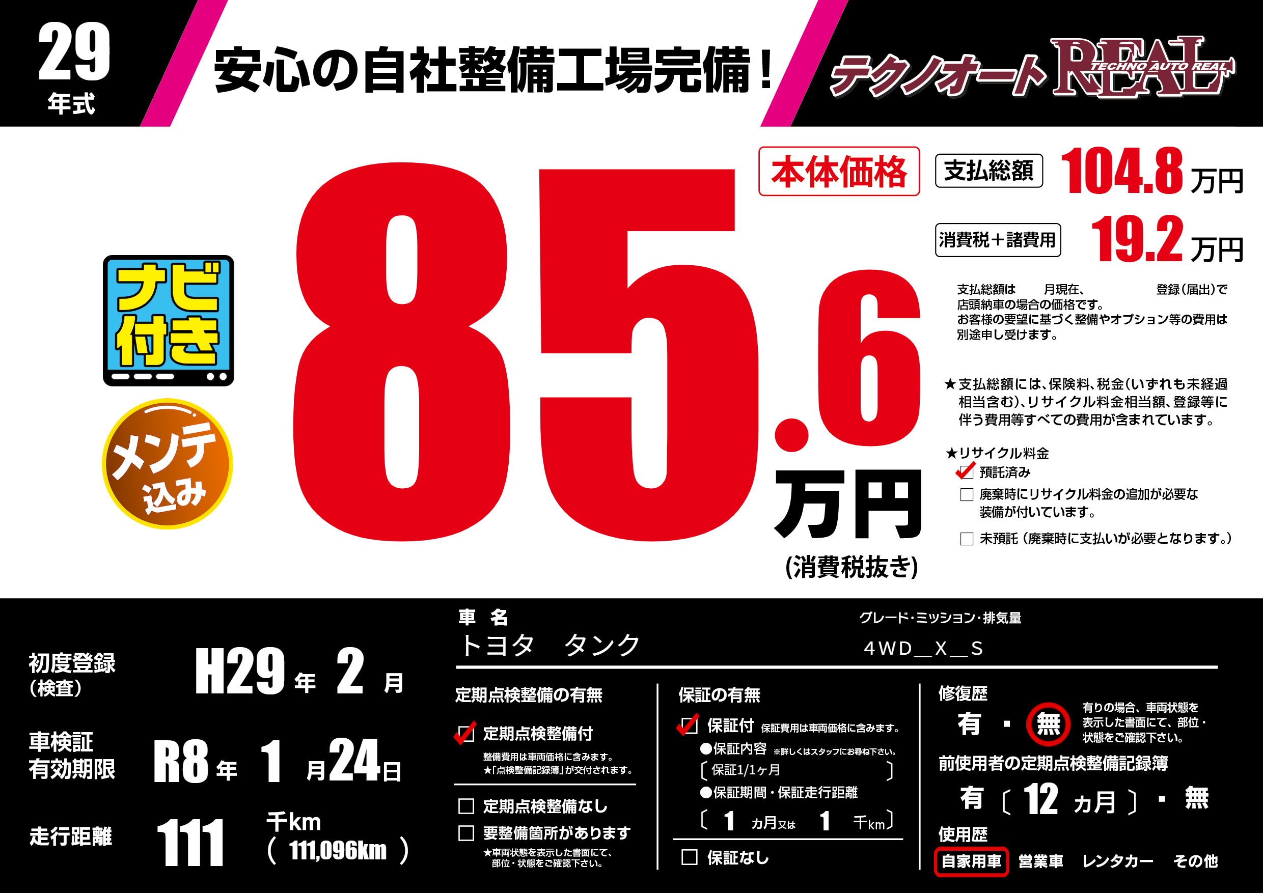 | 車名 | トヨタ タンク | グレード ミッション 排気量 |