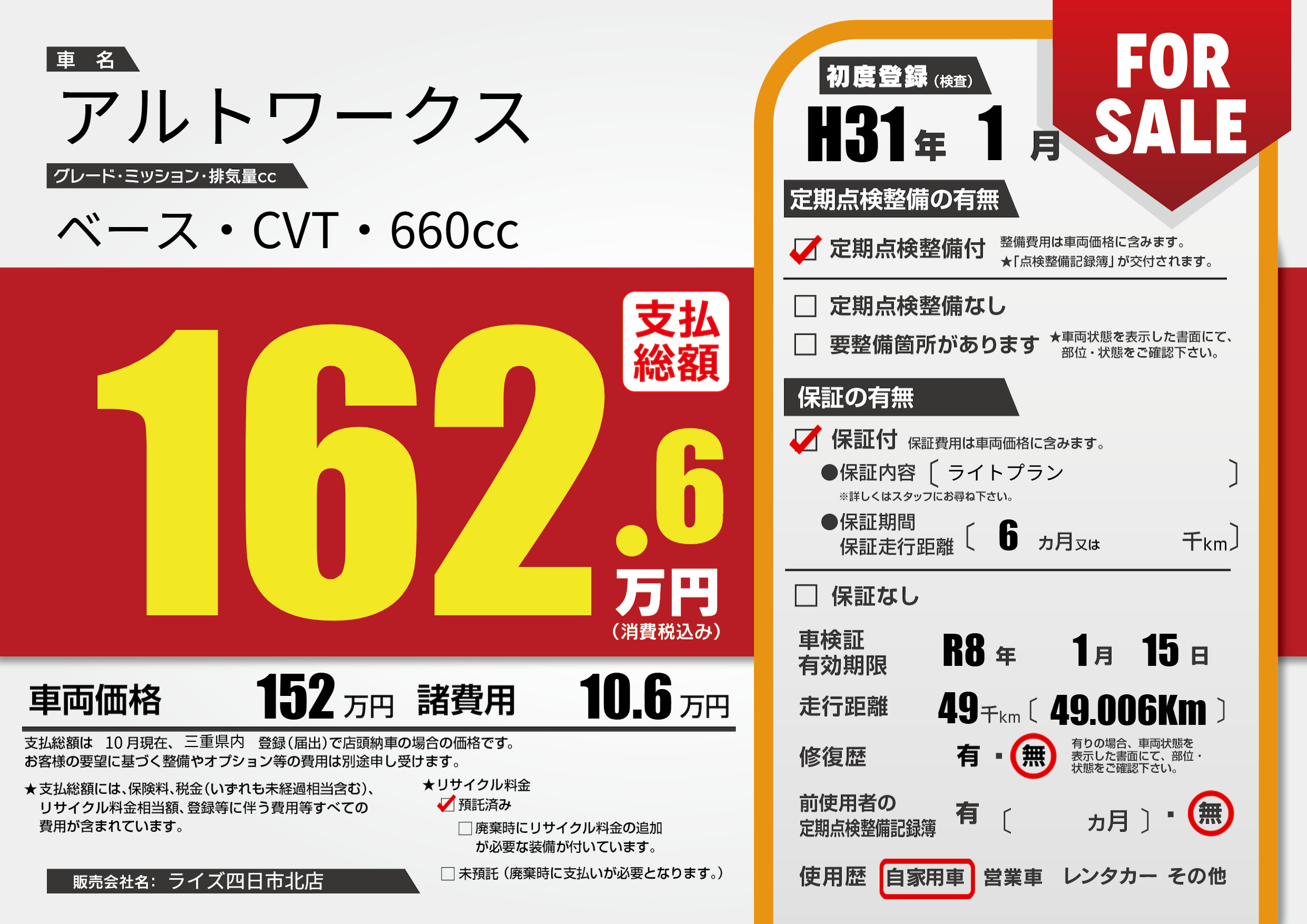 | 車名 | アルトワークス | グレード ミッション 排気量 |