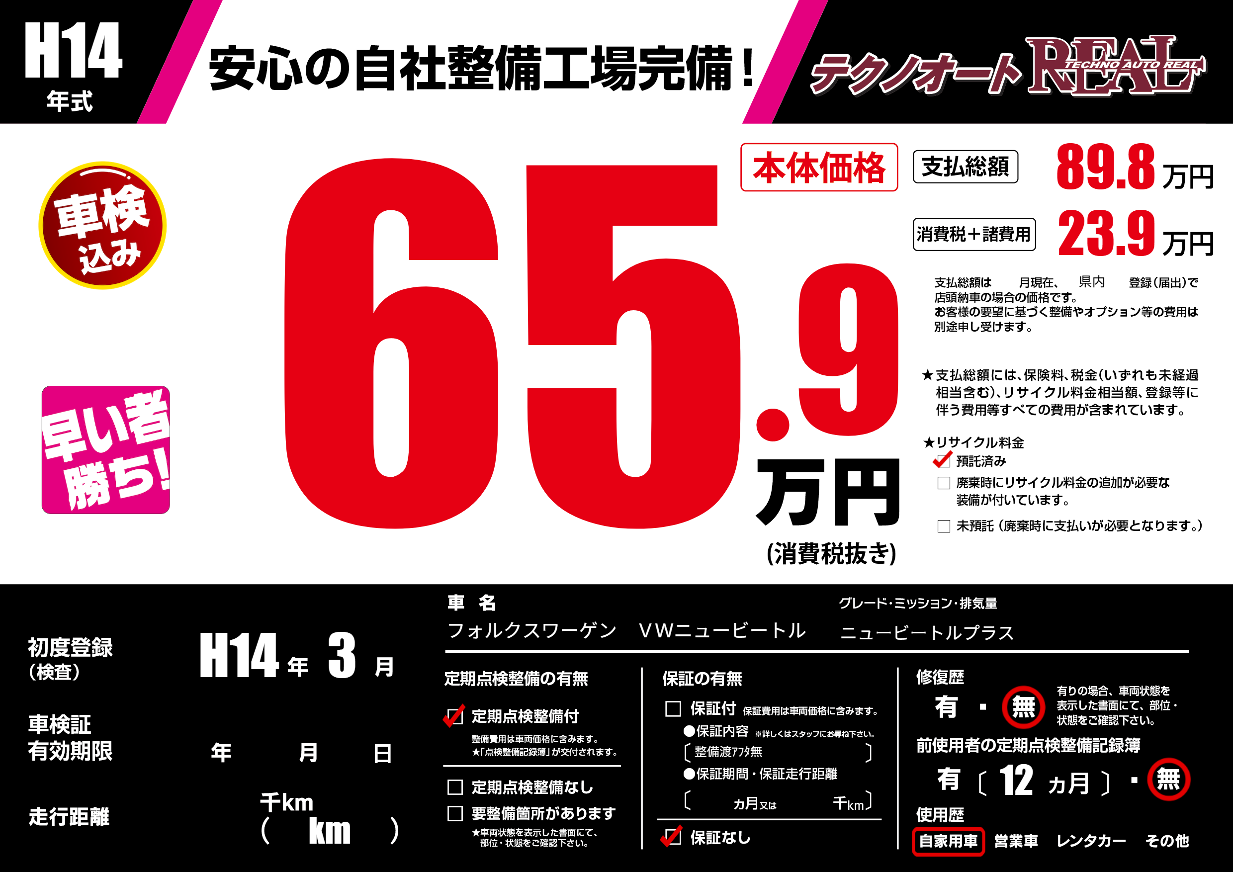 | 車名 | フォルクスワーゲン VWニュービートル | グレード ミッション 排気量 |