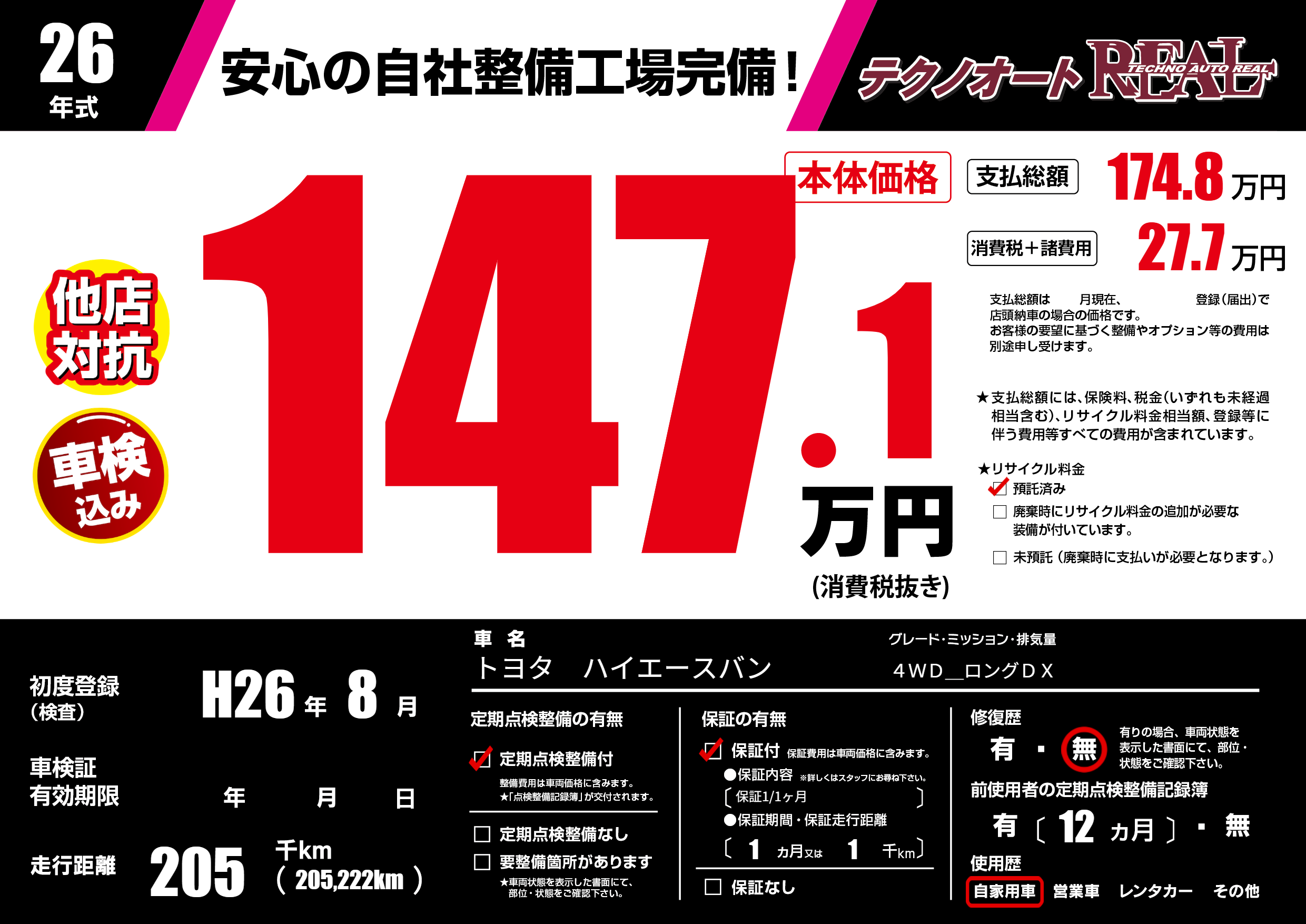 | 走行キロ | 20.5万km | 初年度登録 | H26年8月 |