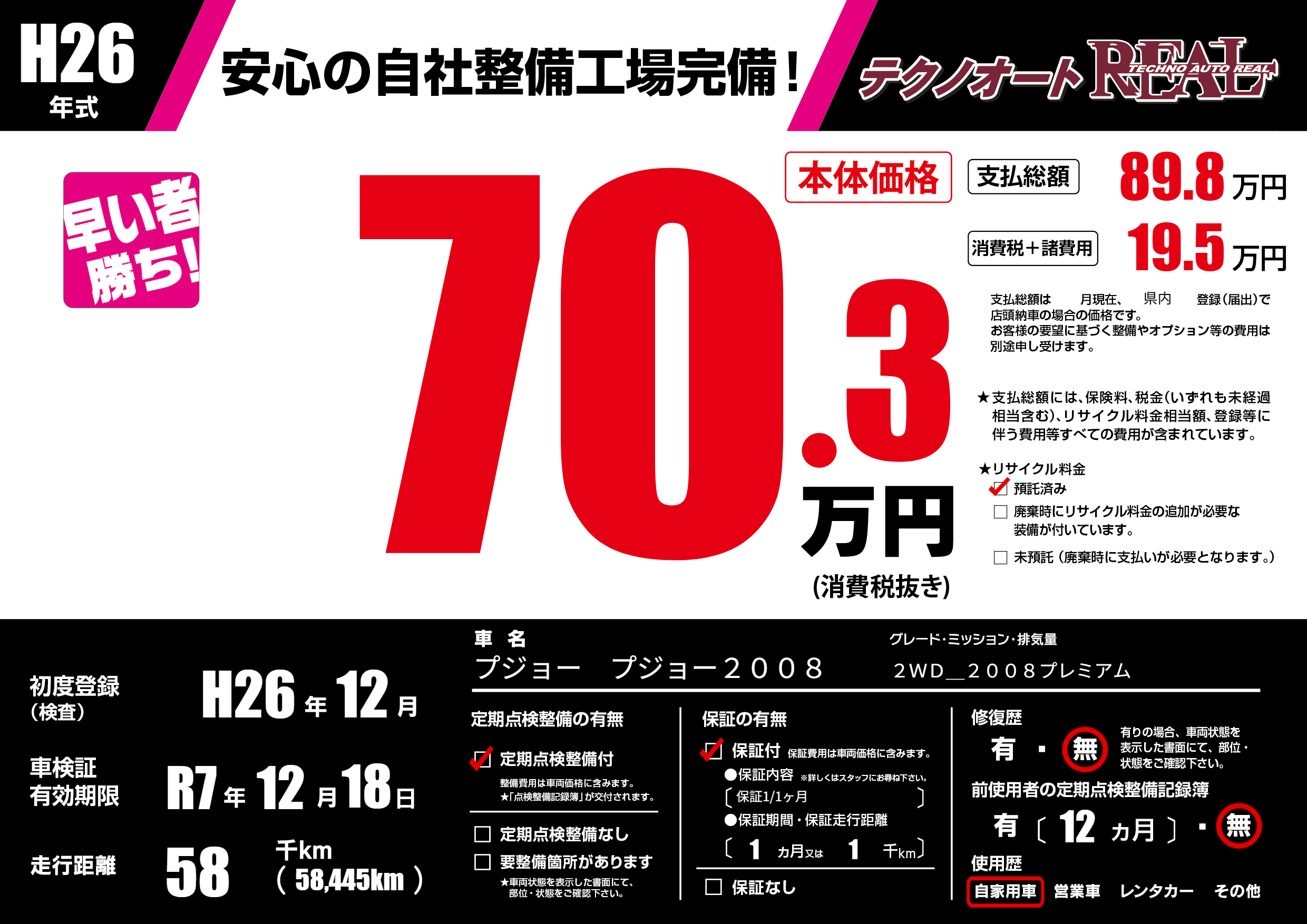 | 車名 | プジョー プジョー2008 | グレード ミッション 排気量 |