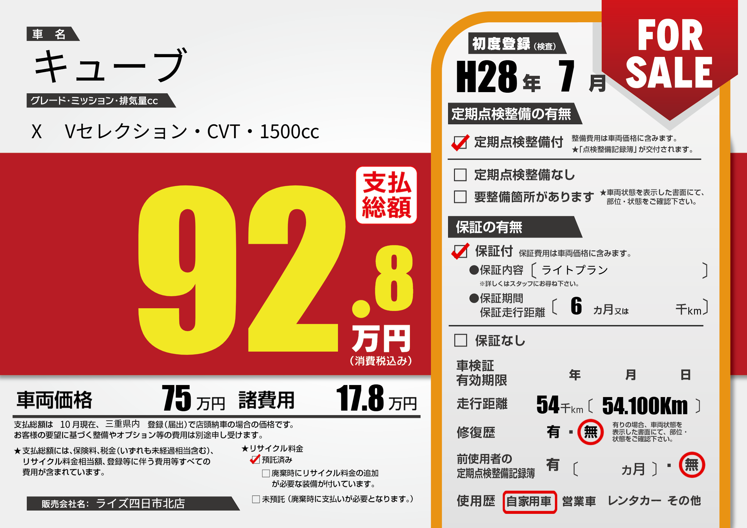 | 車名 | キューブ | グレード ミッション 排気量 |