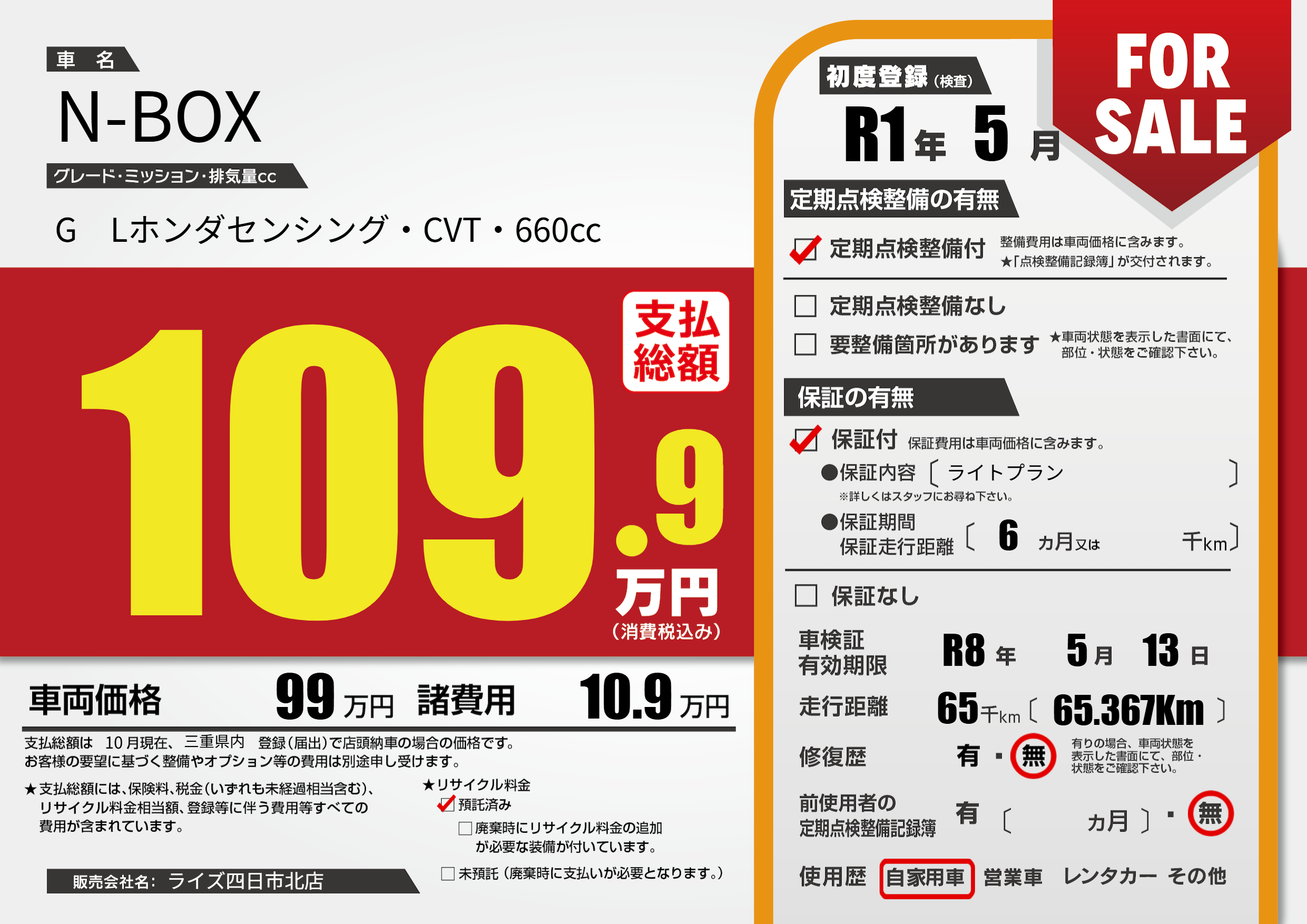 | 車名 | N-BOX | グレード ミッション 排気量 |
