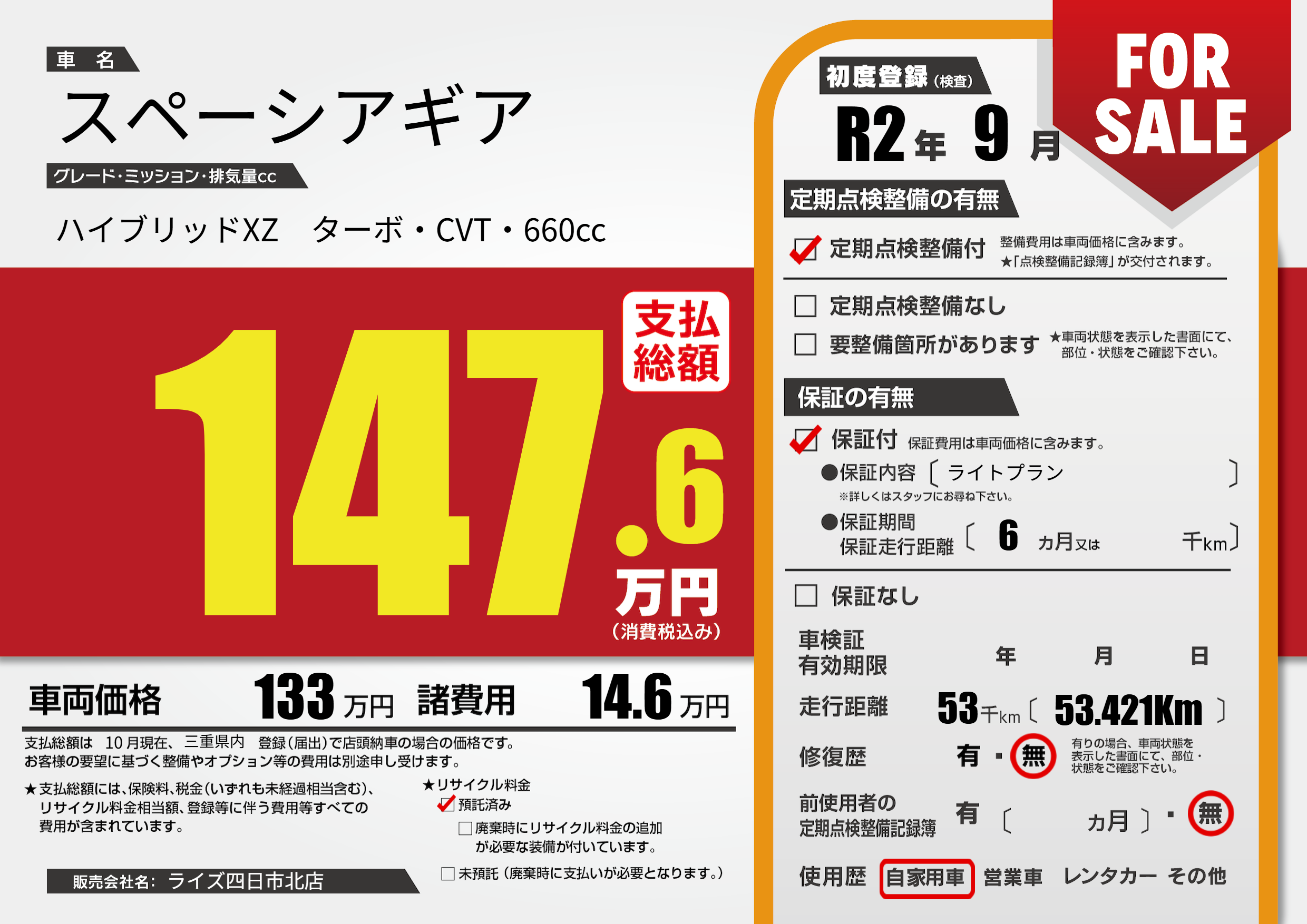 | 走行キロ | 5.3万km | 初年度登録 | R2年9月 |