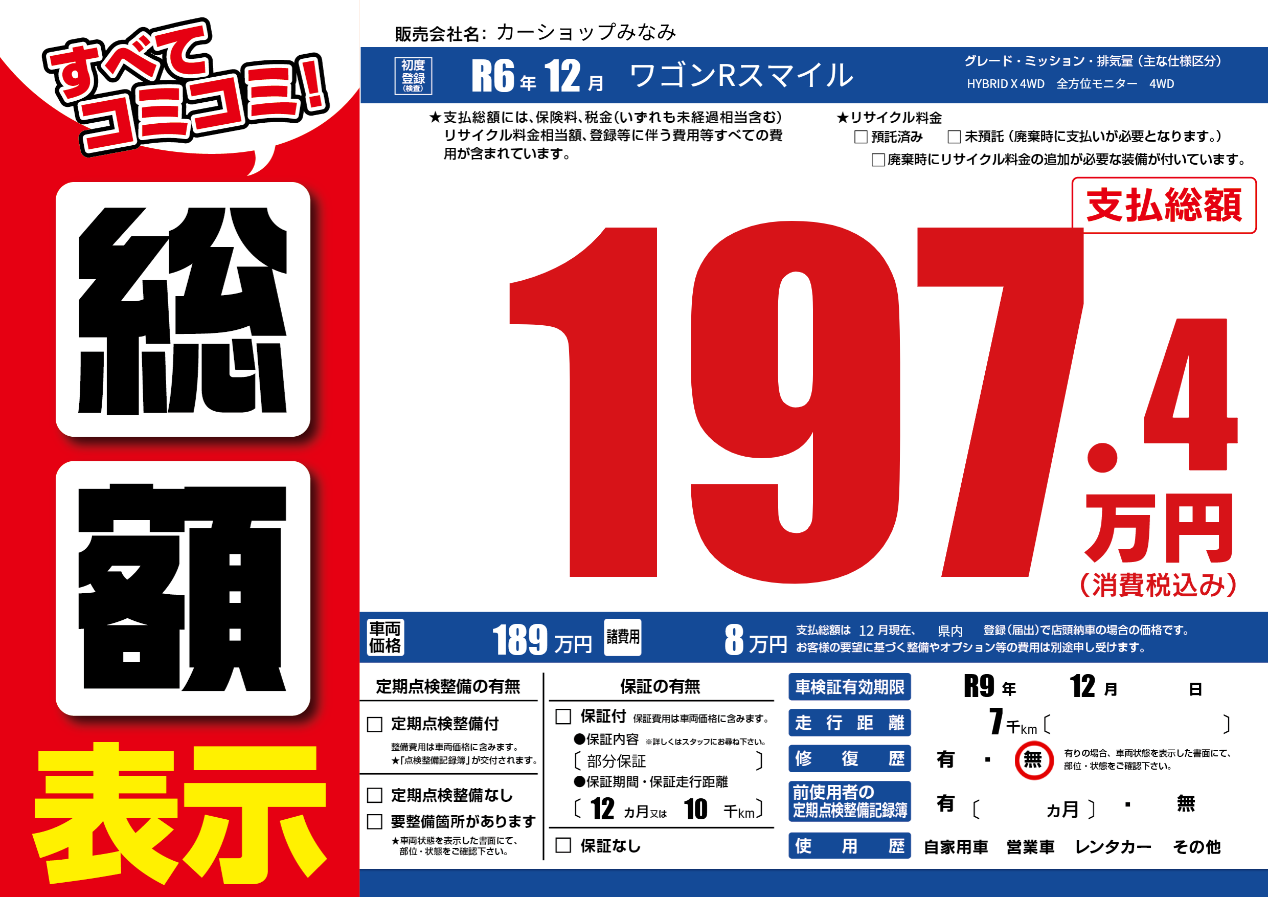 | 車名 | ワゴンRスマイル | グレード ミッション 排気量 |