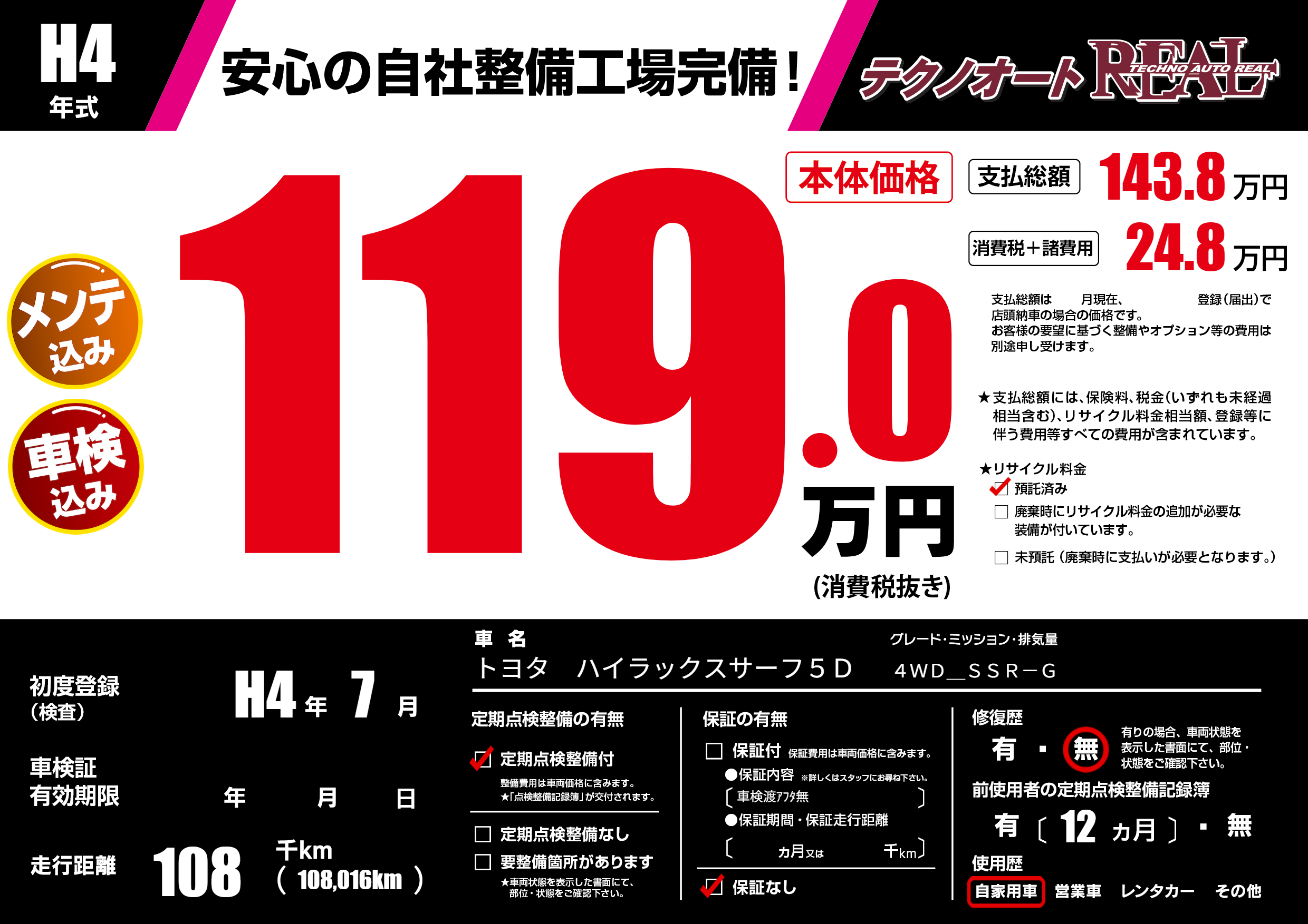 | 走行キロ | 10.8万km | 初年度登録 | H4年7月 |