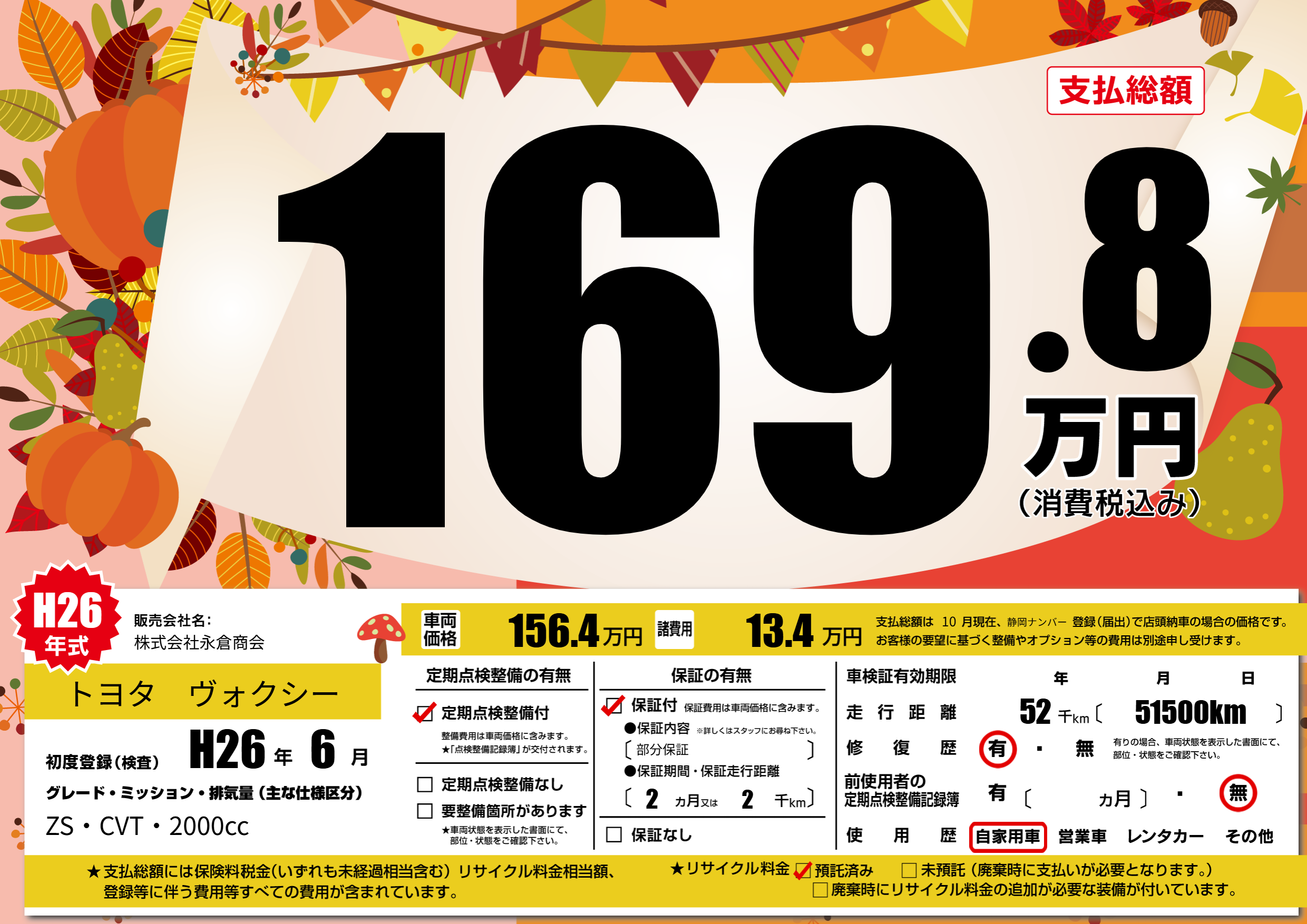 | 走行キロ | 5.2万km | 初年度登録 | H26年6月 |