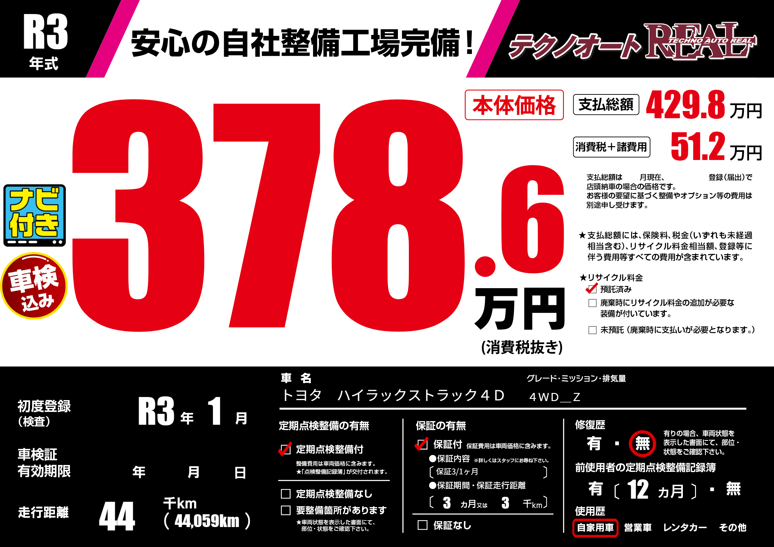 | 走行キロ | 4.4万km | 初年度登録 | R3年1月 |
