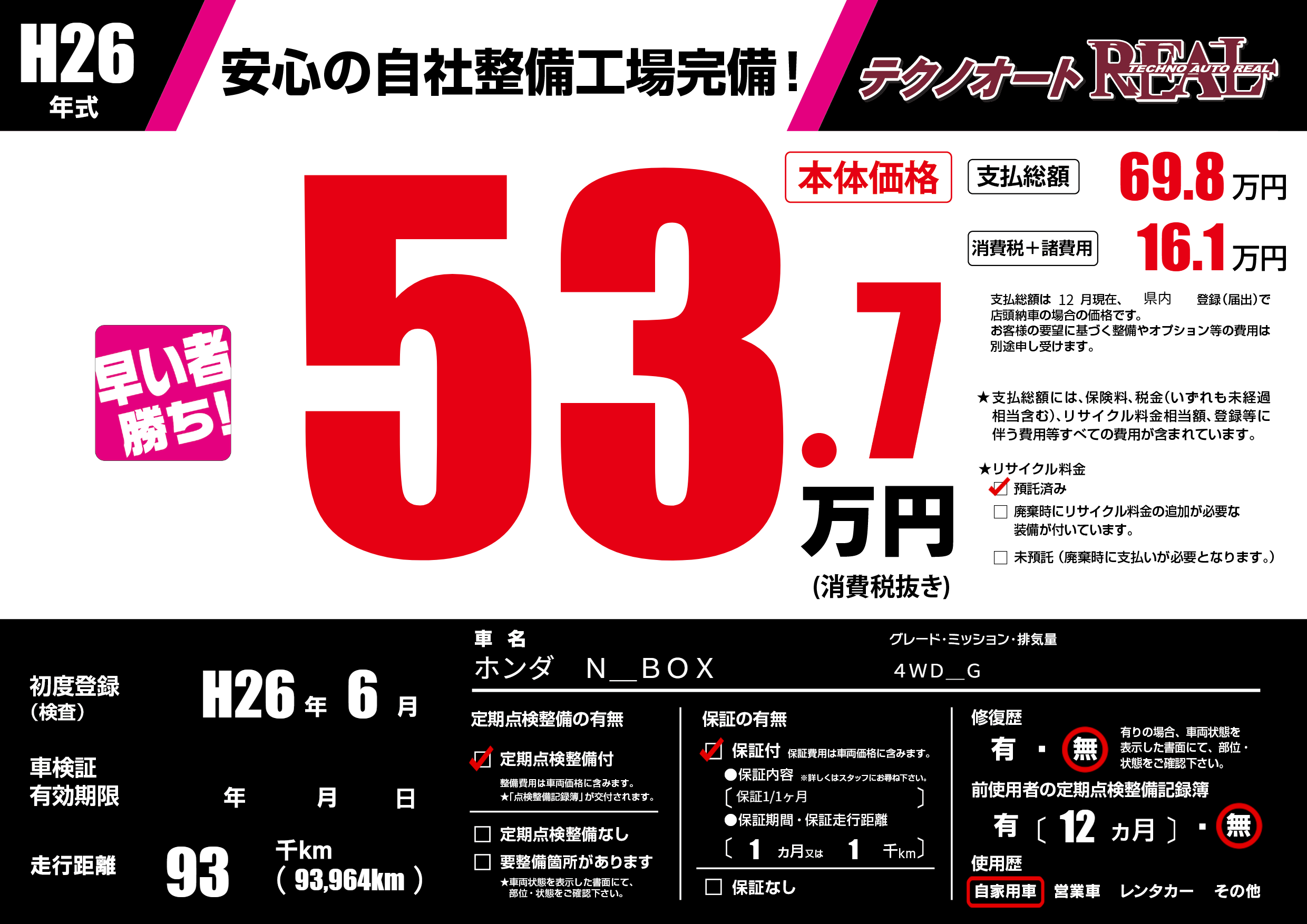 | 車名 | ホンダ N_BOX | グレード ミッション 排気量 |