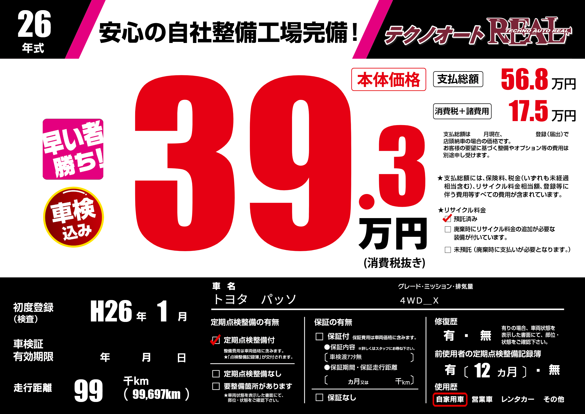 | 車名 | トヨタ パッソ | グレード ミッション 排気量 |